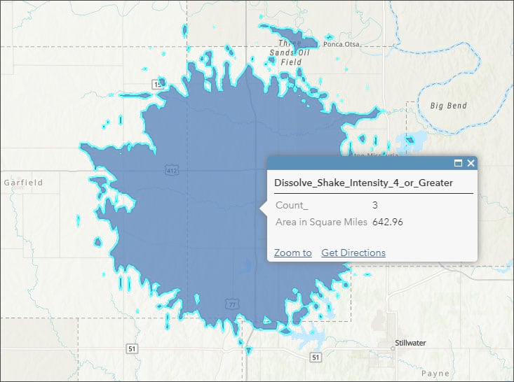 Step 18 — Examine the results. Hide visibility on the Recent Earthquakes group layer and dissolve layer, then click the enriched layer features to view its pop-up.
