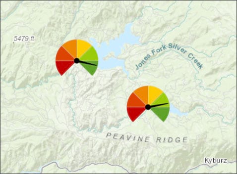 To create the gauge symbols, the layer was duplicated and uses two overlapping and centered symbols; one symbol is the dial background and the other symbol is the needle that is rotated to show the current level of the reservoir. See Create dials and gauges using stacked symbols and rotation for more information.