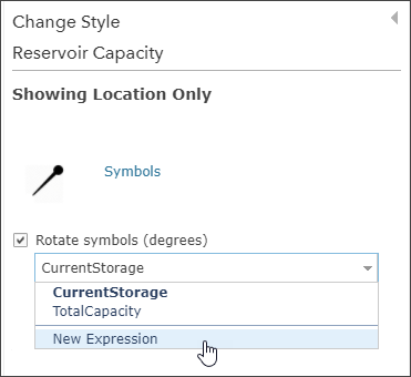 An Arcade expression is used to calculate the needle symbol rotation that shows the reservoir level as a percentage of its total capacity. The crux of the expression is to determine the rotation in compass degrees needed to rotate the needle to represent the appropriate percentage full value on the dial.