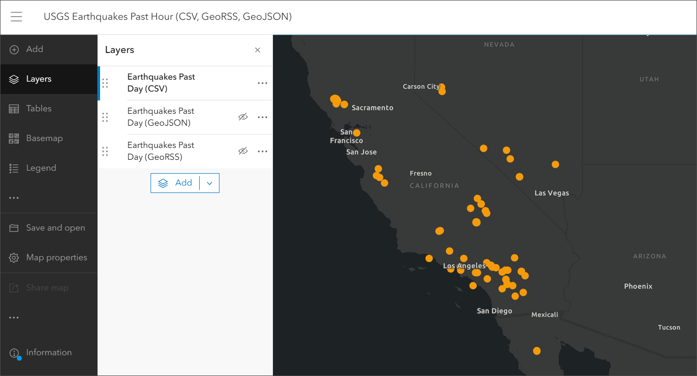 You can add the USGS GeoJSON files and GeoRSS feeds from the following locations. The workflow is the same as described above for CSV file.