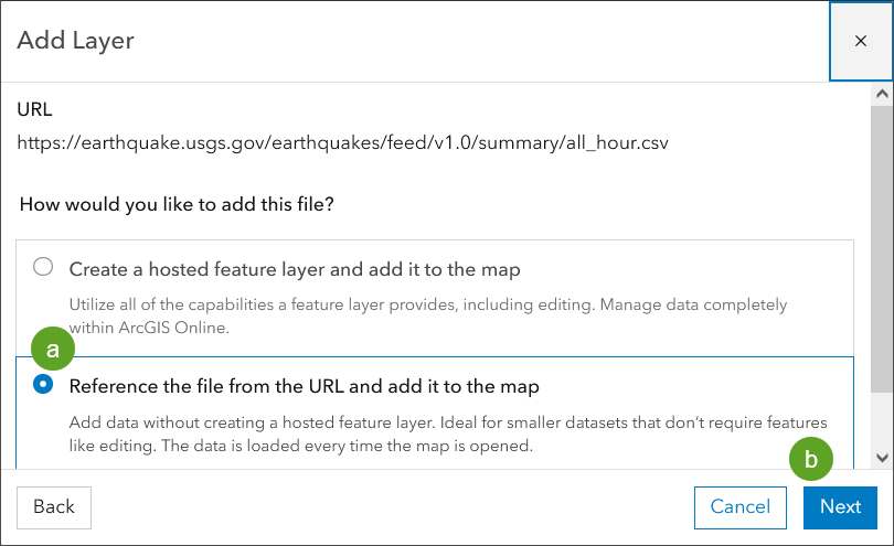 Step 4a – Add the file by referencing the file by URL. If you choose to create a hosted feature layer, a snapshot of the current status will be published and you will need to update the hosted feature layer manually.