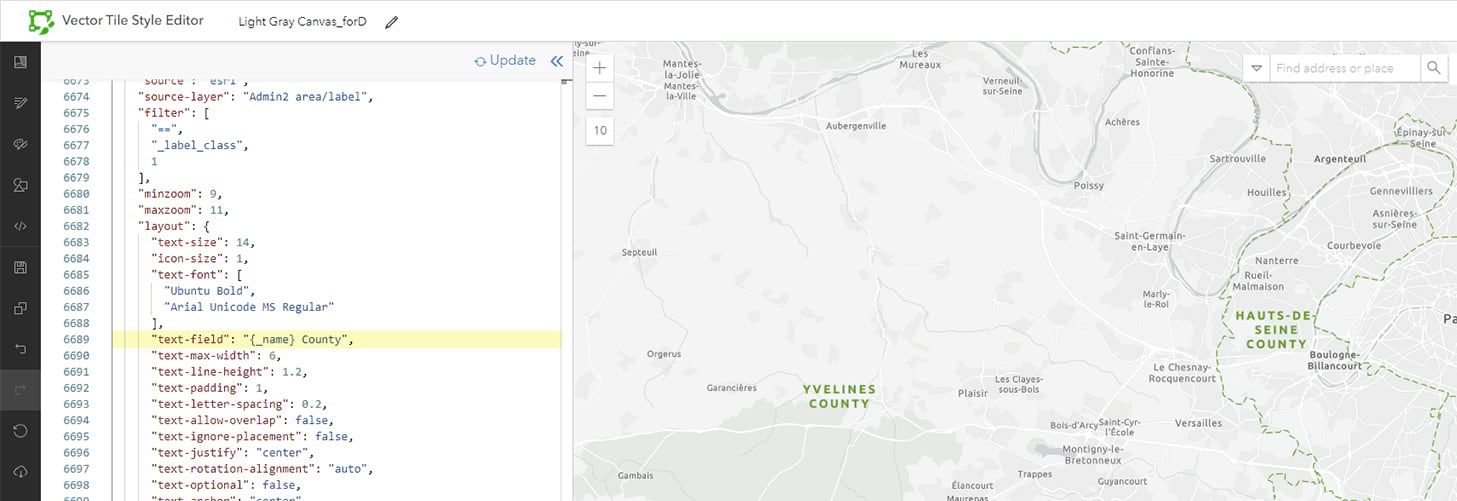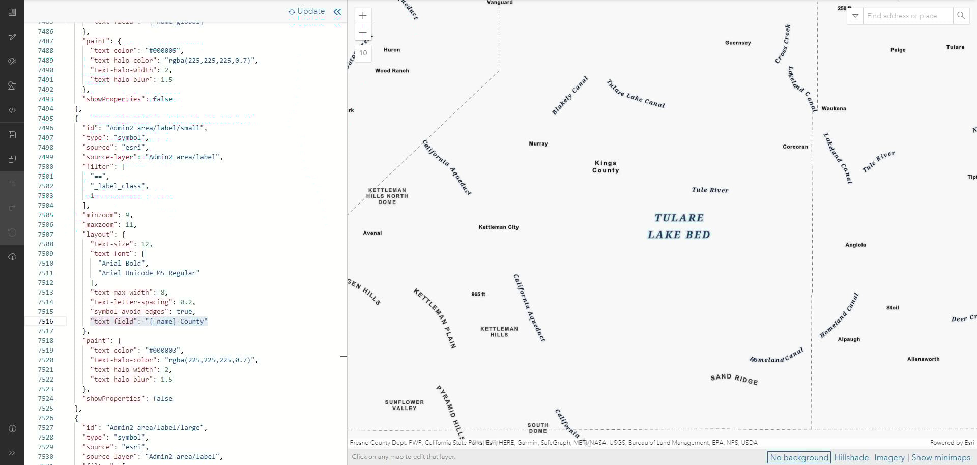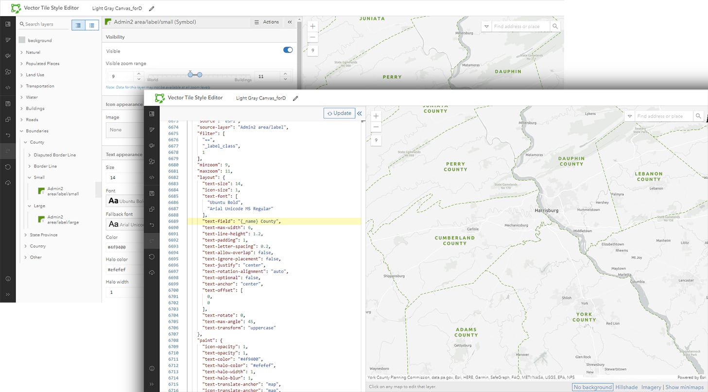 Like Andy also showed, let’s add the word “County” to our Administrative 2 layer by adding it in the JSON “text-field”.