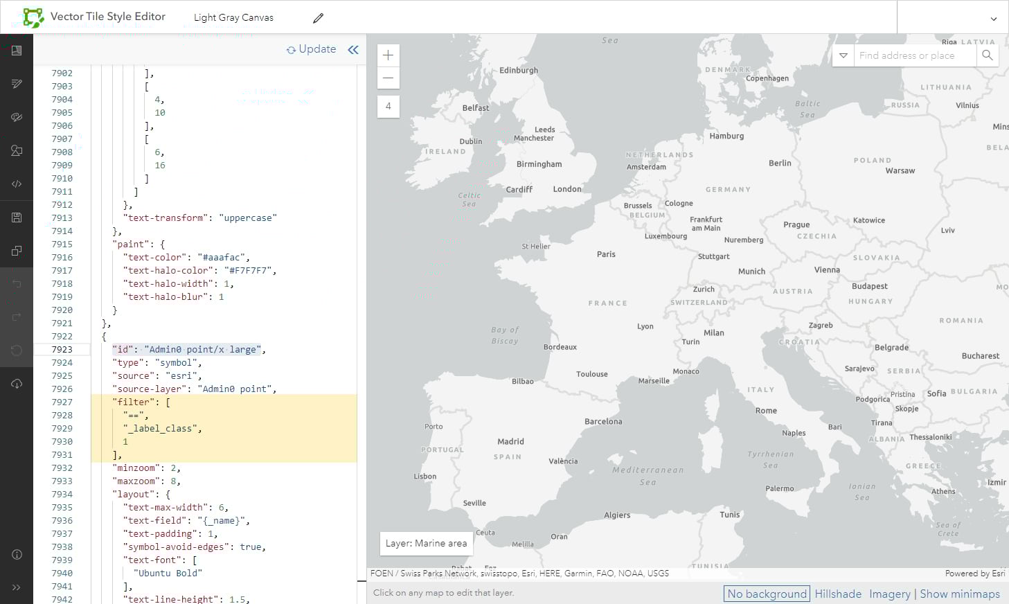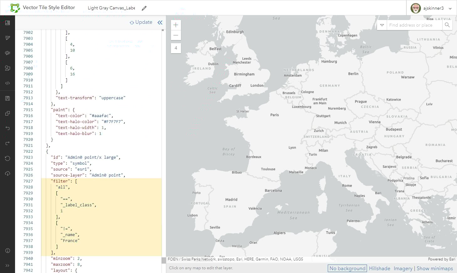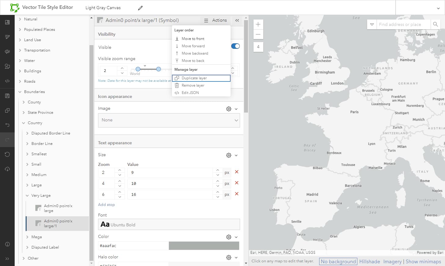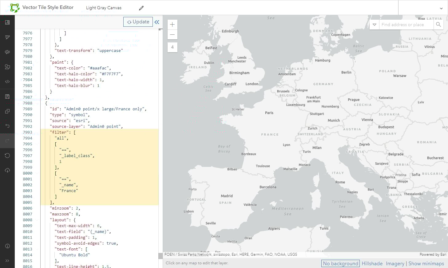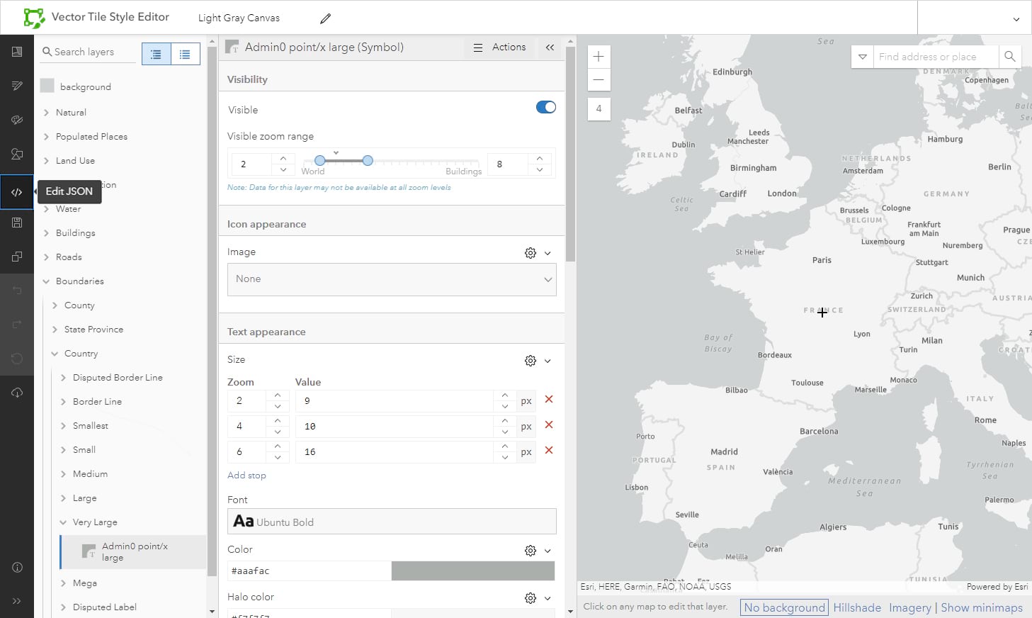 For this example, I’m using a single-layer version of the Light Gray Canvas Map, so I’ve opened it into the VTSE and saved it. I want to modify just the ‘France’ label. To do this I’ll remove it from the existing layer, then duplicate that layer and adjust the code to bring it back on its own. Once that is established, I can make my custom modifications.