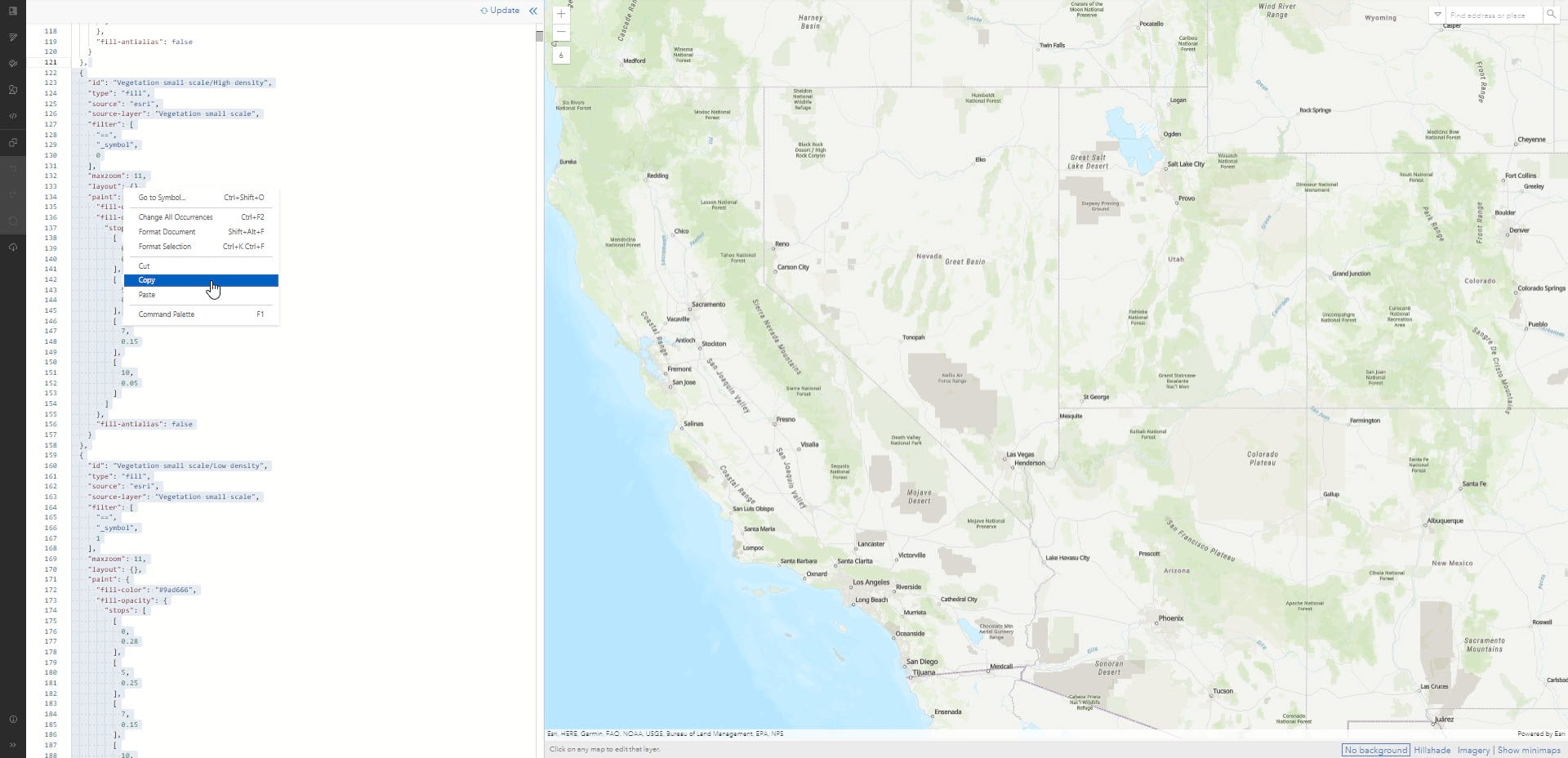Did you know you can copy code from one basemap to another? In the Vector Tile Style Editor within the World Topographic Map under ‘Natural’ there are two layers in the ‘Vegetation’ category. We can use those to emphasize the forested areas. Open up the JSON Editor and take the code containing the two vegetation layers and copy it out (lines 121-195).