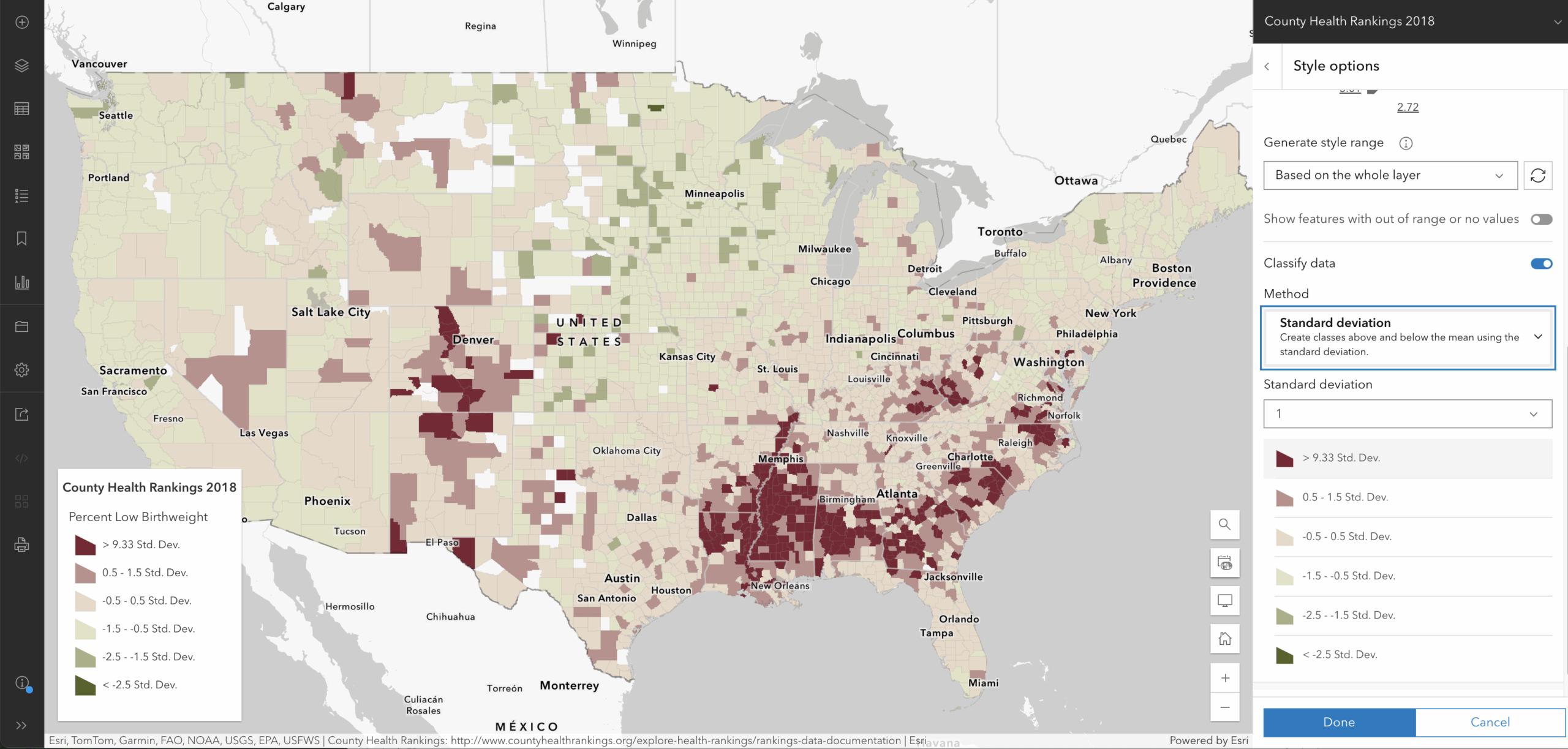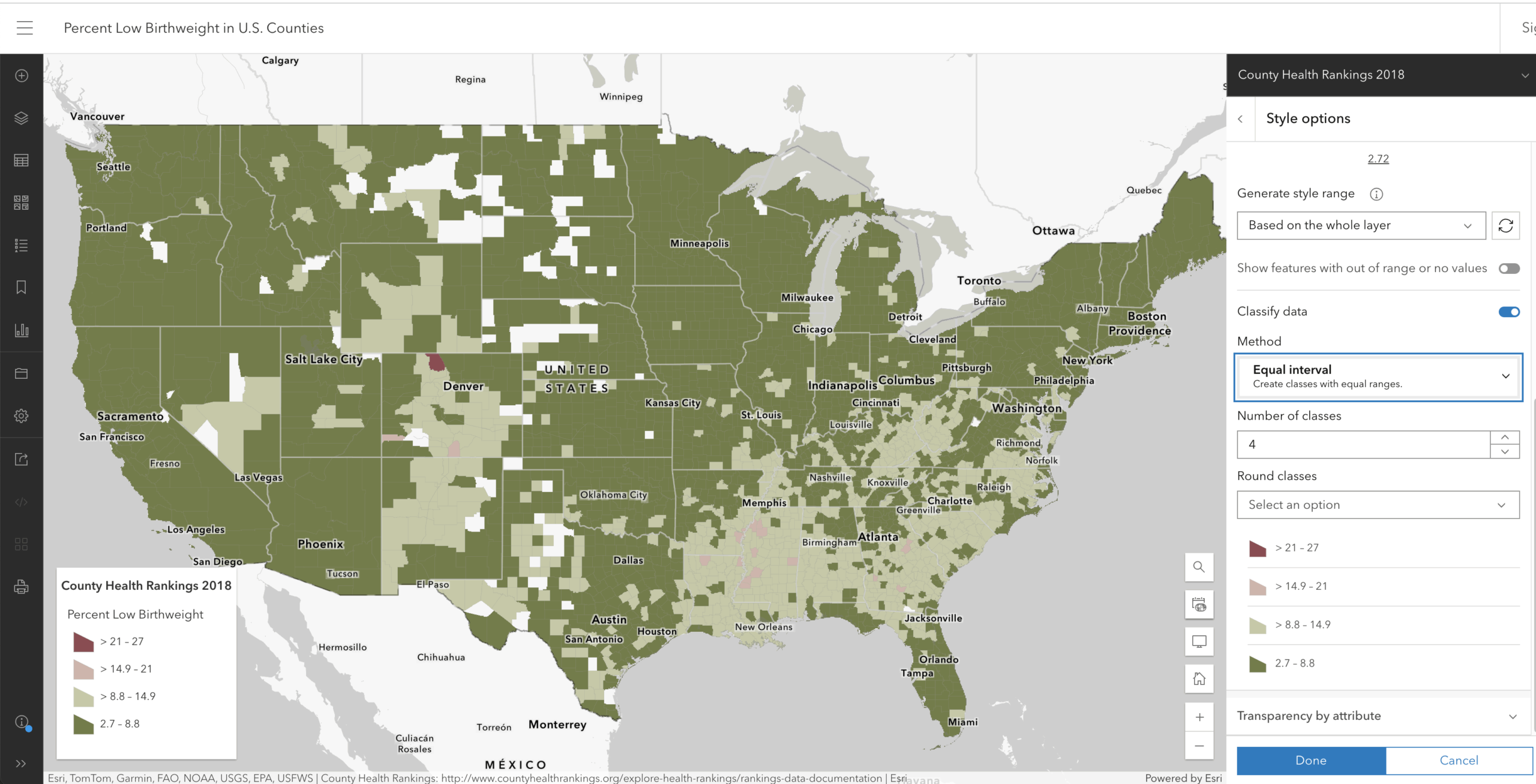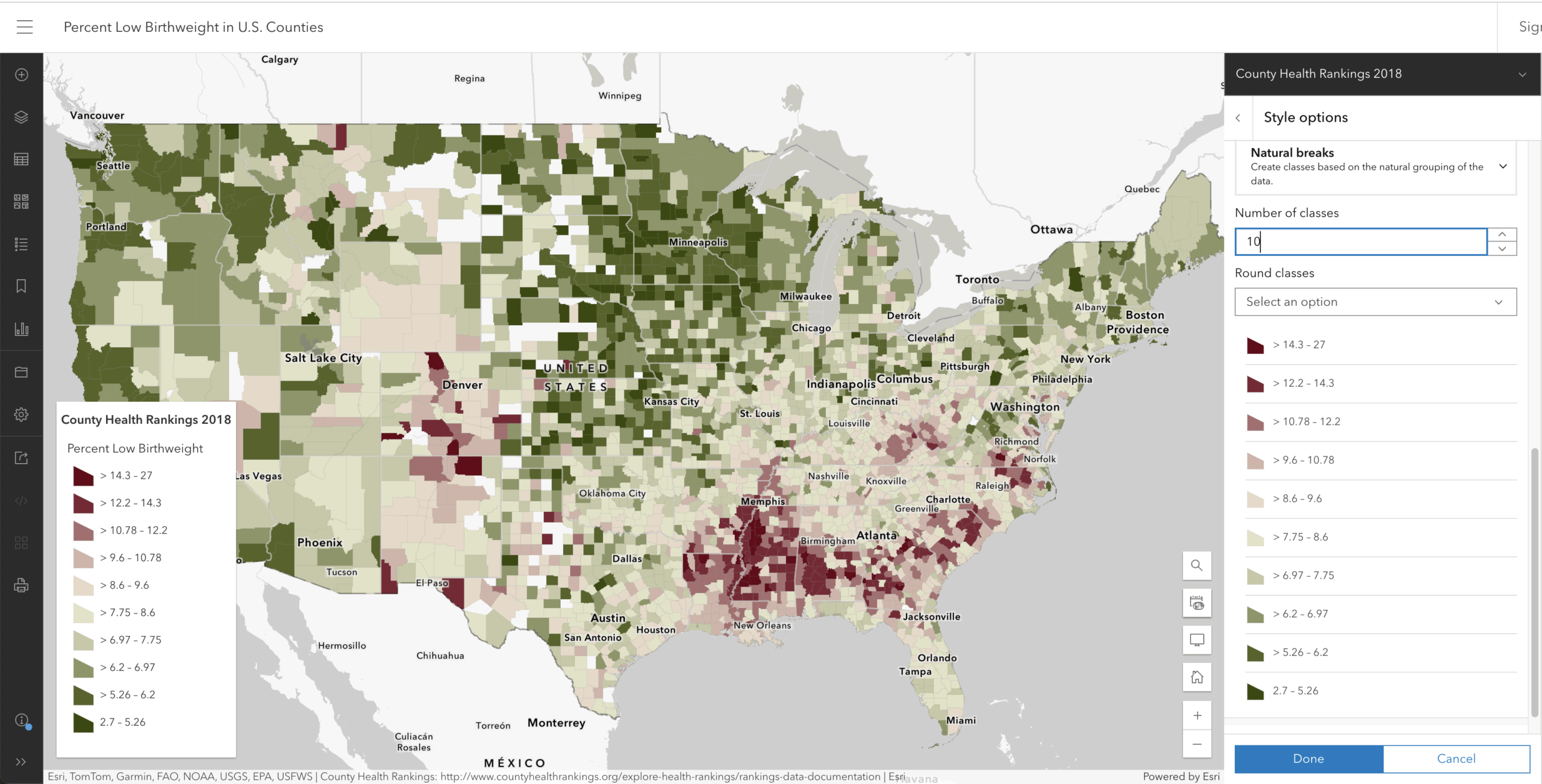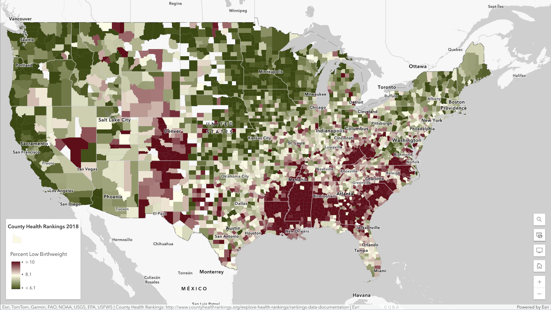 Open this web map which uses layers found in ArcGIS Living Atlas, and click on the “Layers” button in the top left to see the list of layers available. Turn off the layer “Low Birth Weight % – Above and Below theme (recommended)” and turn on the layer at the bottom of the list titled “County Health Rankings 2018.”