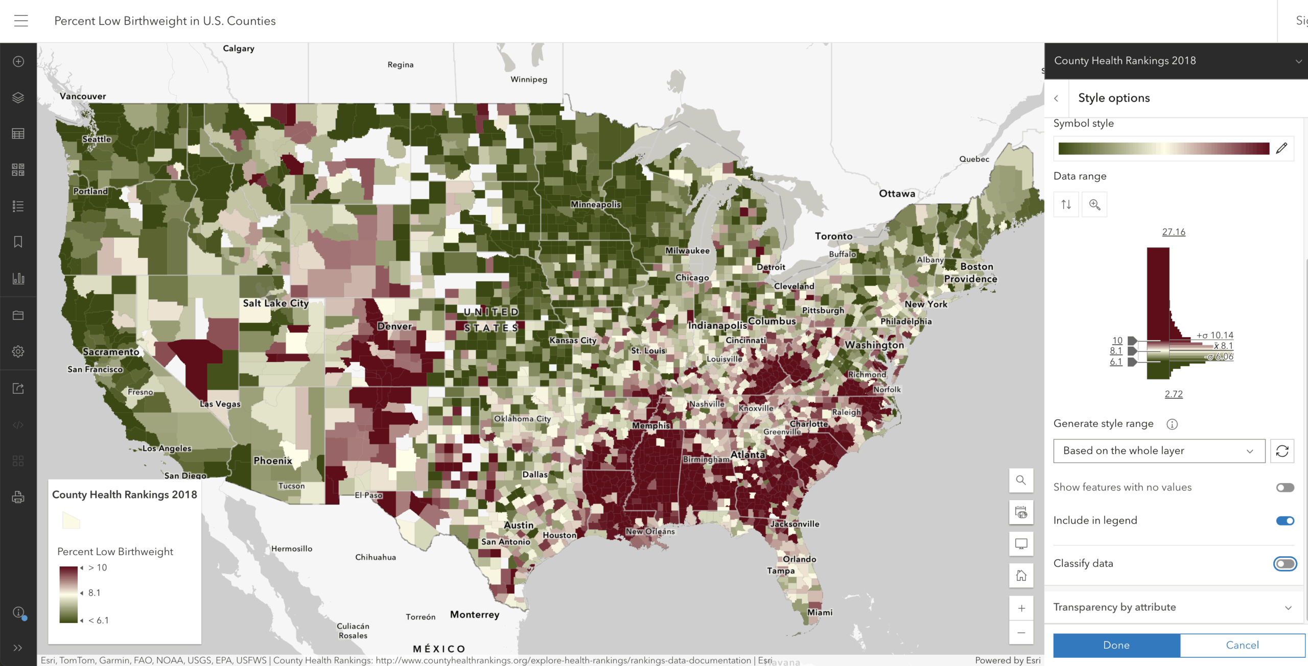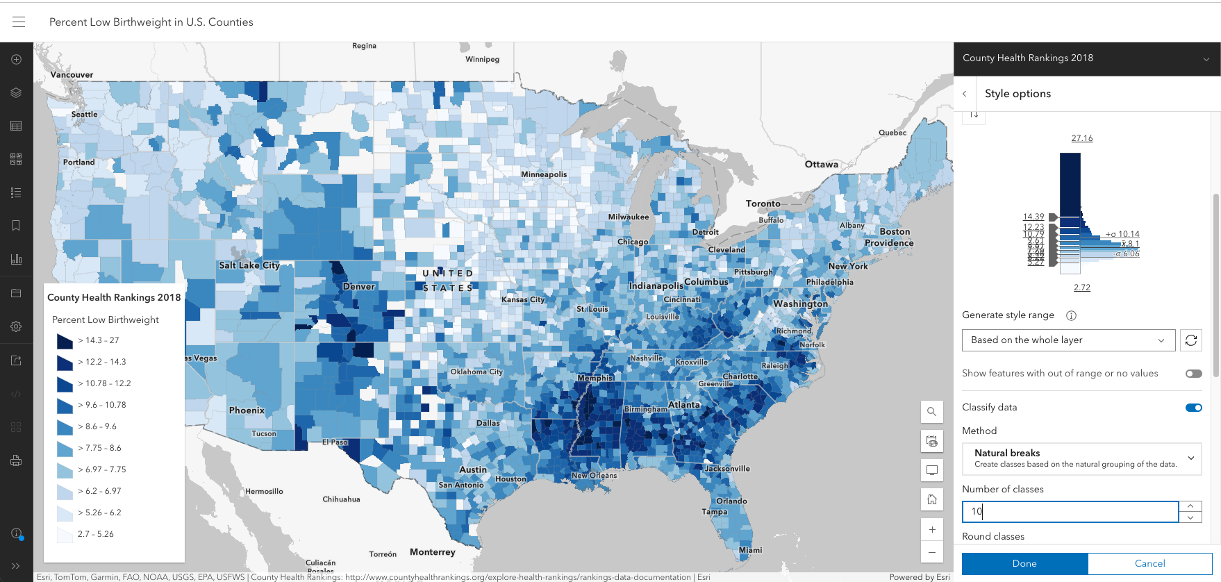 ArcGIS Online shows you the color ramp next to a histogram of the data. For the “High to Low” theme, the little handles on the left side of the histogram indicate at what values dark blue or light blue are applied. In this case, counties with 10% low birth weight or higher are given a full dark blue color. Counties with 6.1% or lower are given a very light blue color. These extreme values are not the main story in this map style.