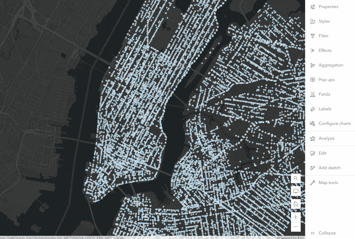 Did you know you can aggregate your data into bins Map Viewer? If you’ve read Kristian’s blog you will know that binning aggregates data to predefined cells, effectively representing point data as a gridded polygon layer. Binning in Map Viewer can show the aggregated data with a defined bin boundary which is different from the other clustering styles available. Binning your point features can help you identify patterns in your data that may be missed when viewing individual features.