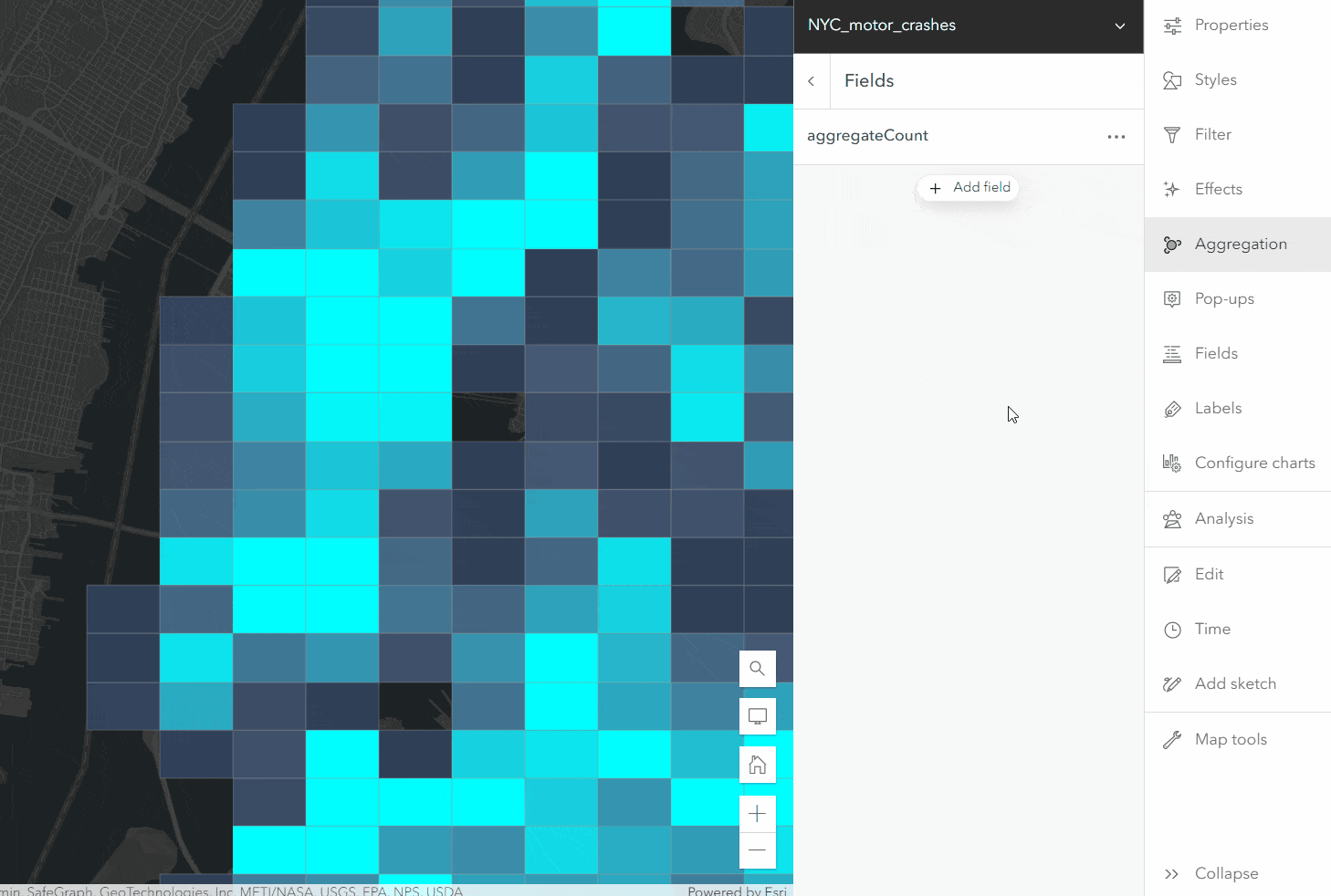 Bin fields – When opening the fields section for binning there will be an autogenerated sum field for the number of features within a bin. This field can be used for labeling and popups. By default, it is used for styling the bins. You can also add your bin fields by clicking on the Add Field button in the panel and selecting the field from the dataset you would like to calculate a statistic on. This will create a “virtual field” that can be used in the bins for the selected statistic and will not be added to your dataset. A field in the layer can be used multiple times to view multiple different statistics like in the instance of this dataset we may want to know the mean and median value of a field for crash counts in a bin along with the sum of crashes within a bin. Numeric fields can be used to calculate sum, mean, median & predominant values. String fields will be used to find the predominant value of the aggregated features.