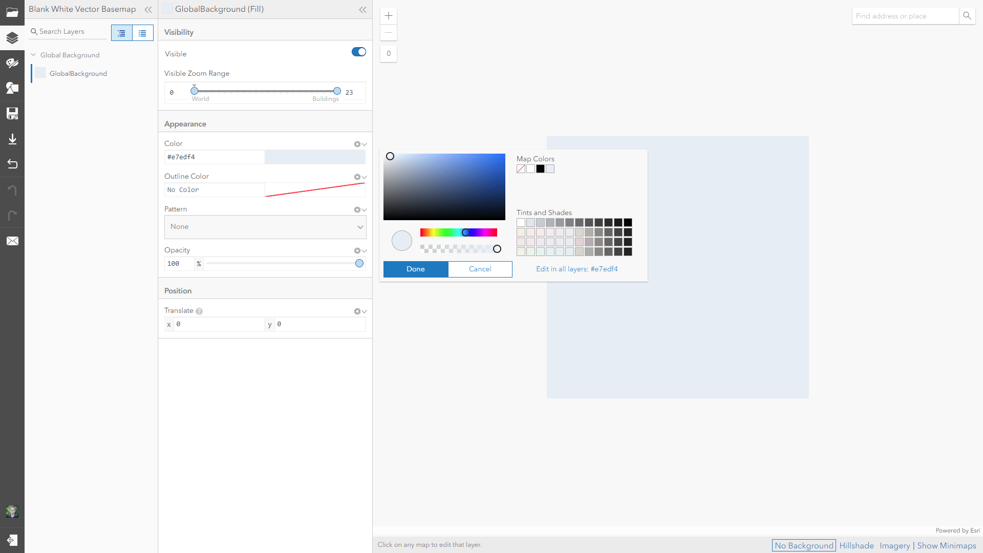 I’ve made a black canvas and a white canvas. But you can use the Vector Tile Style Editor to paint the canvas whatever color you like. Here is a link to it, pre-loaded with the white basemap canvas.