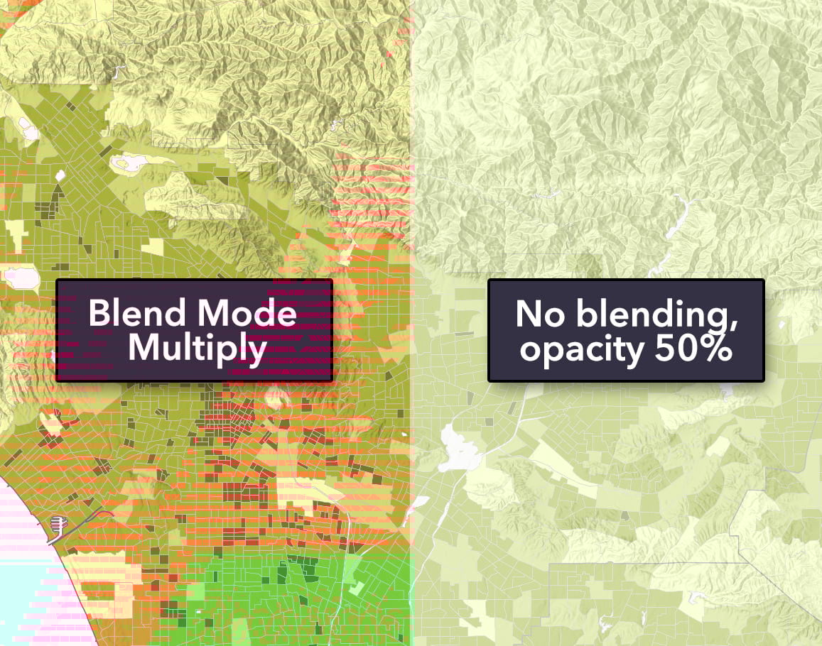 Best of all, the layers remain independent map layers. This is all nondestructive. In other words, we’re not changing the underlying data or the original colors of the layers. And I can remove the blend effects with a single click at any time.