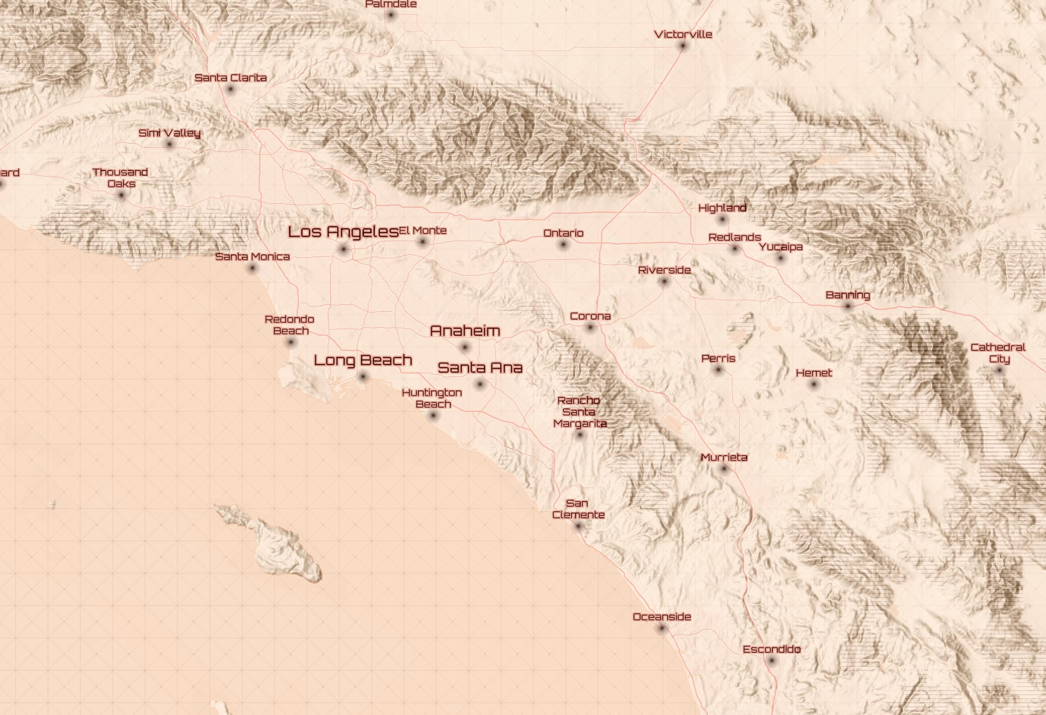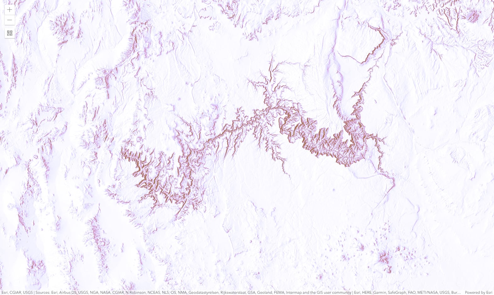 Want to go one step further? Bring in more than one giant world polygon and give each a unique color. In this example, Esri’s hillshade expert Rajinder Nagi mixes four layers (why not?) using World Hillshade (Luminosity), World Brown Polygon (Lighten), World Purple Poly (Color Dodge), and World Hillshade (Dark). The result is a light, subtle map that keeps its details and is perfect as a new basemap with labels, map symbols, and other features on top. Have a look at an example here.