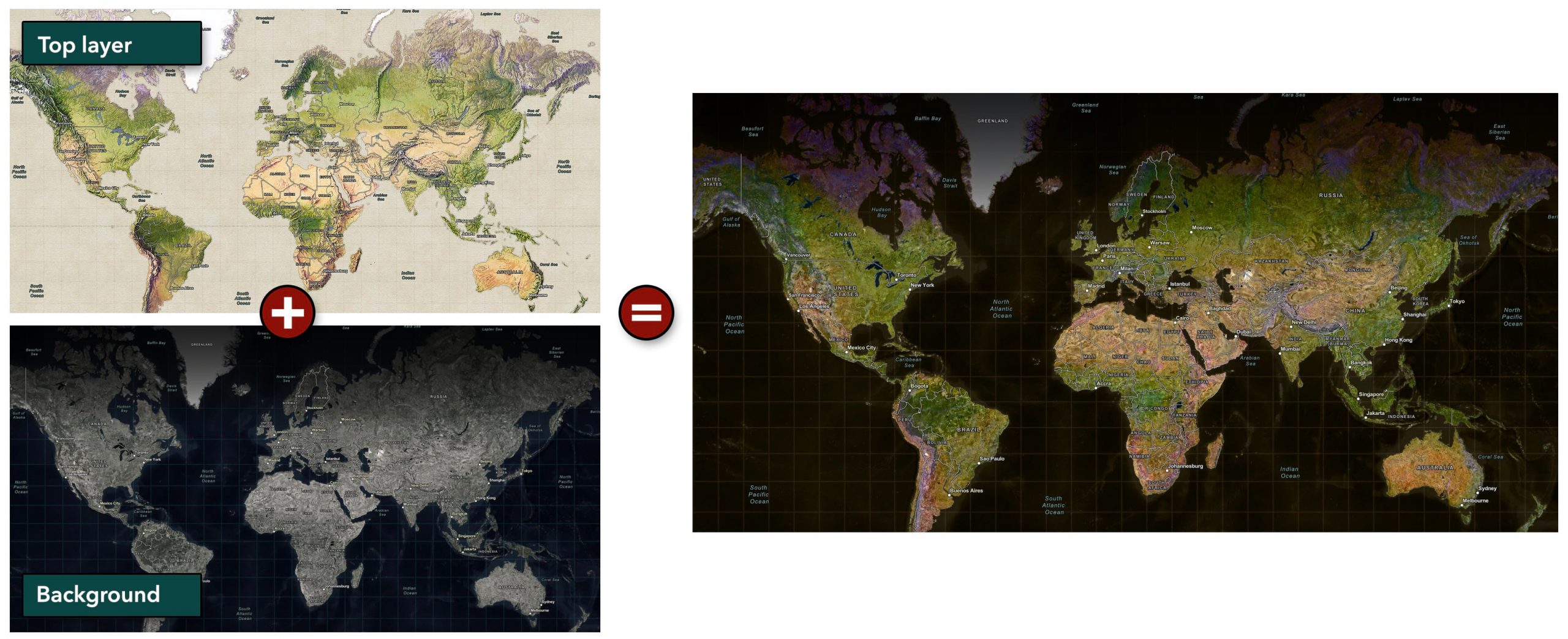 My colleague Undral Batsukh shows how powerful blending can be when you selectively control how color, luminosity (brightness), and saturation interact. Here, the vintage shaded relief layer has the Color blend mode applied to it, over the firefly world imagery layer. It creates an effect using the hue and saturation of the top layer and the luminosity of the background layer. This keeps the dark ocean from the firefly but preserves the bright colors of the vintage hillshade for the land areas. The land also shows a nice blended texture from both; see the Amazon basin. See the web map.