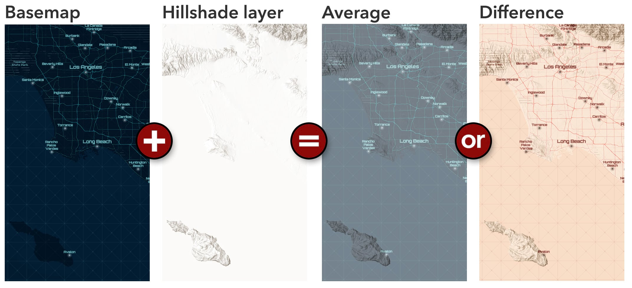 One of the more peculiar items in ArcGIS Living Atlas of the World was submitted by master cartographer John Nelson: he made a map with just one giant polygon on it. The size of the entire earth and nothing else. A rectangle as big as the world; how does this help us? As seen below, by tinting this polygon, you can add a uniform and subtle color to the entire scene. Even better, using the Color Dodge or Color Burn blend mode (familiar to photographers and Photoshop users), you can selectively add those tints to just the highlights or the shadows.