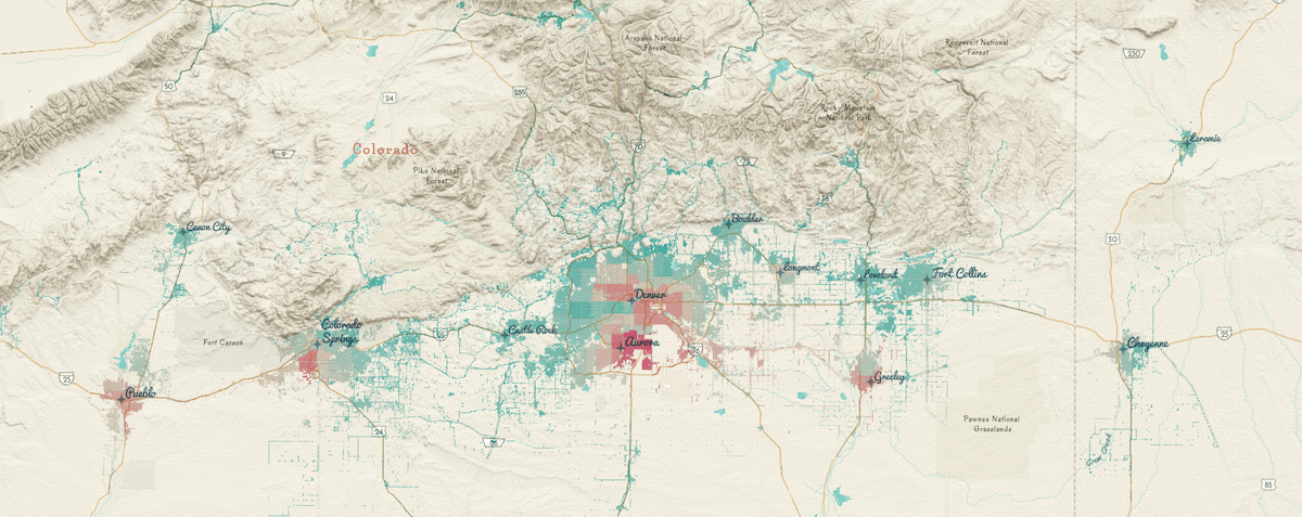 In the map below of diversity index around the Front Range, Colorado, the destination-atop blend mode gives a more accurate depiction of how we live than solid blocks of color, which imply a continuous pattern across the land. This map reveals the density of the subject. Solid color blocks of polygons hide it.