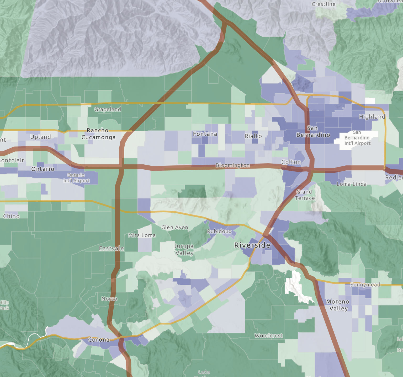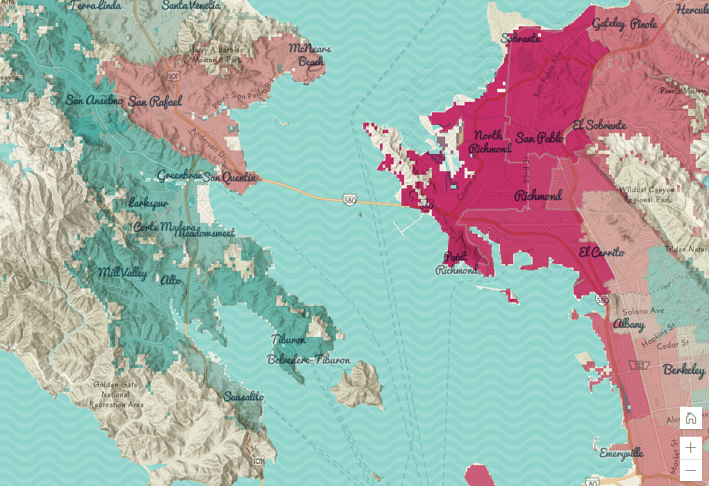 In the web map below (login required), looking at diversity northwest of Berkeley, CA, we see that populated areas fill with color, while areas that are sparsely populated or empty get no color. More diverse areas are shown in red, less diverse areas are shown in blue. The basemap’s information helps explain why an area appears to have no data – it is because that area is not populated. This example uses destination-atop mode on the population layer, and puts the layers into a group, then applies the multiply mode to the group layer.