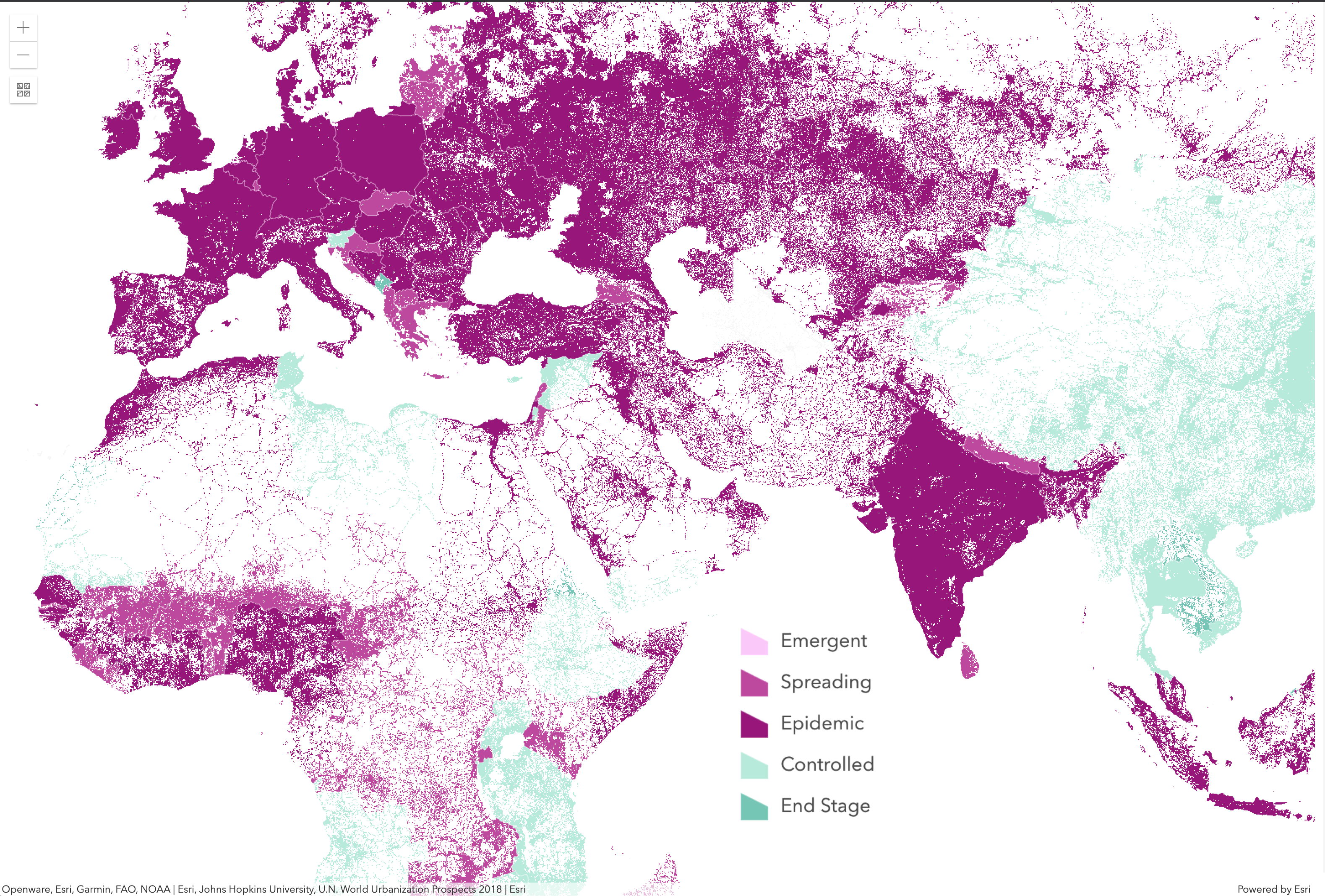In the next example web map below (login required), we see Global COVID-19 Trends by country from ArcGIS Living Atlas, blended with WorldPop’s Populated Footprint in 2020 layer available in ArcGIS Living Atlas. Densely populated countries become more self-evident in this view. Purple areas are in Epidemic or Spreading stages. Norway’s coastal population is in evidence, as are densely populated India and Ireland. Can you spot Cairo, Egypt and the Nile River?