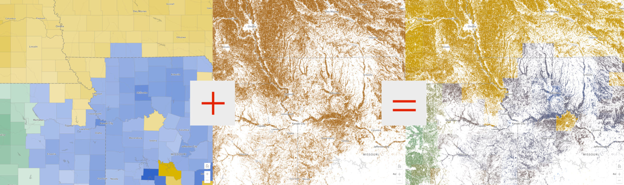 This type of combination can work with many other pairs of layers: blend population grids with any demographic or statistical analysis results; business locations with sales or market opportunity; residential land use with tax revenues by county… it is a different way of thinking about your layers blended with other layers.