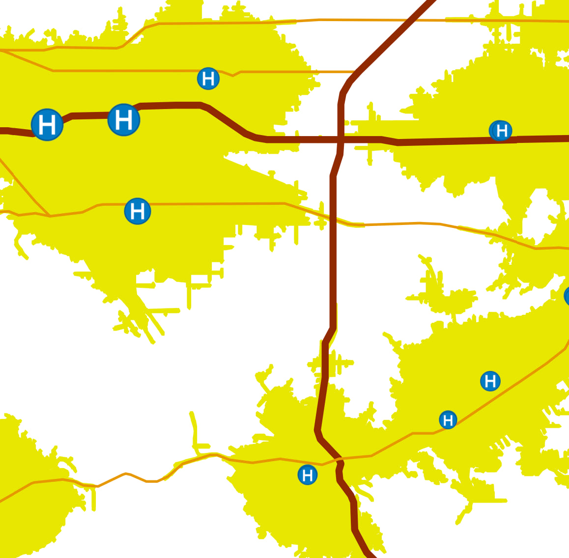Transparency is one way you can mix two or more layers’ information. For example, you can set a polygon layer’s transparency to 50% transparent so that the basemap’s features can also be faintly visible. In the map below, the yellow service areas are within 11 minutes of a hospital emergency room. I set the yellow polygons to be 50% transparent so that some of the basemap’s content would show through.