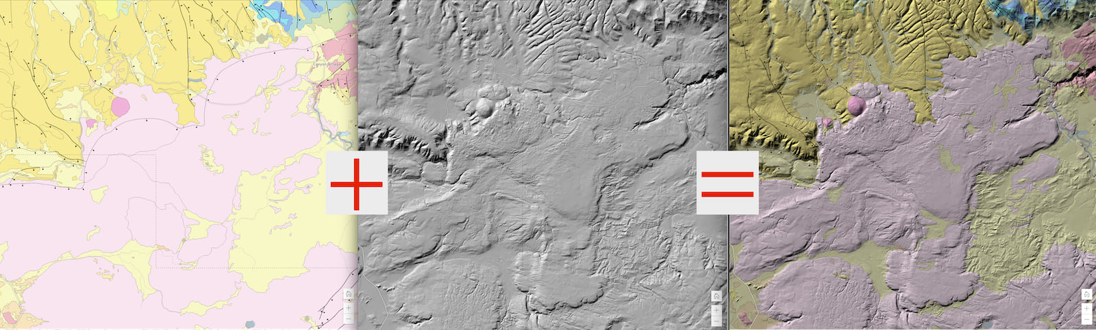 Software programs like Photoshop have had a “blend” capability, where the software performs calculations on each layer’s pixels to apply various visual effects to those pixels. In the example below, geology polygons plus terrain equals a much more pleasing map because the terrain has something to do with the polygons’ topic.