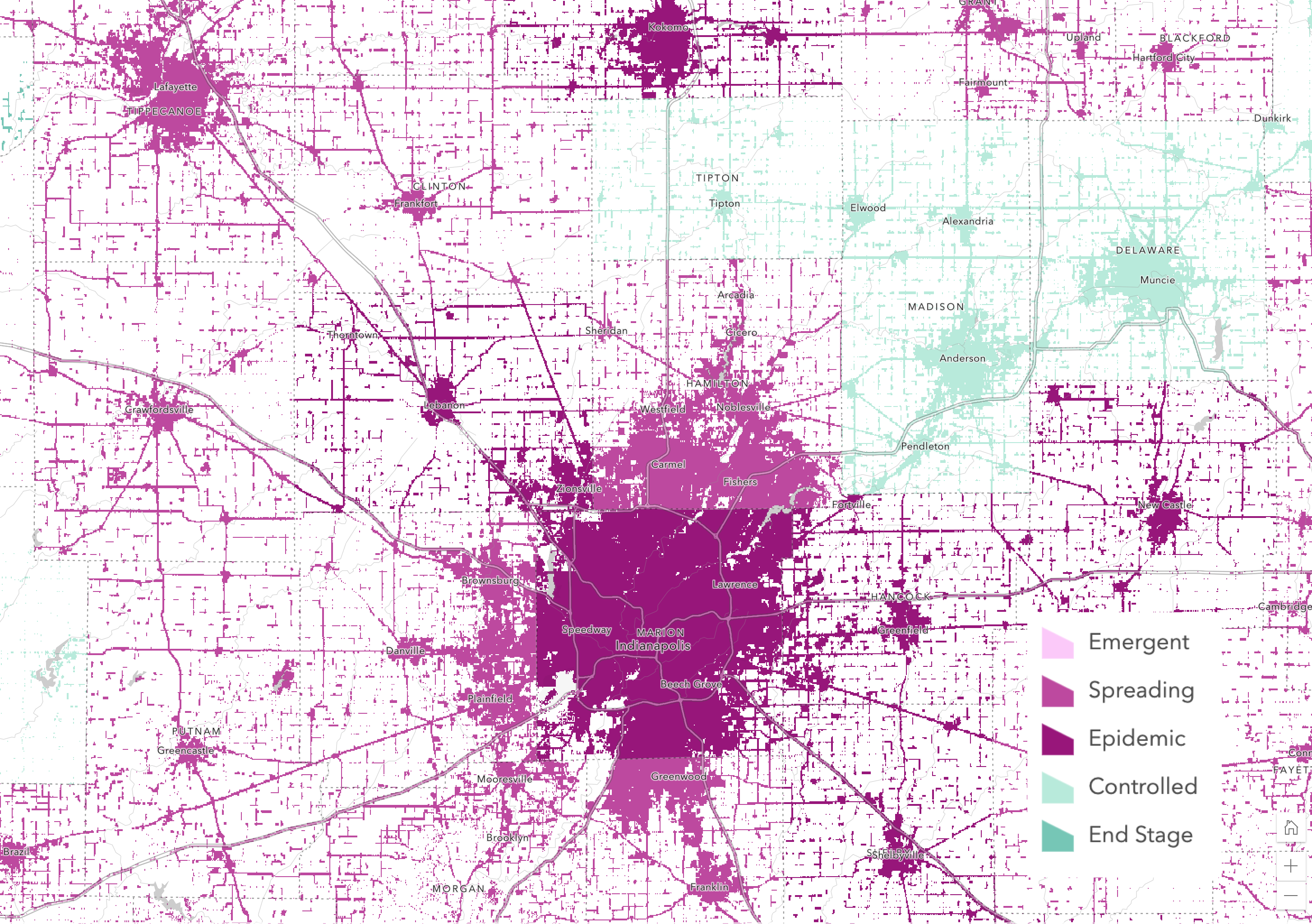 This view below of Indianapolis does a good job depicting COVID-19 Trends by County information within the densely populated downtown, as well as suburban areas and smaller towns surrounding the city. At the time this image was taken, downtown was in Epidemic stage, while the county just north is in Spreading stage.