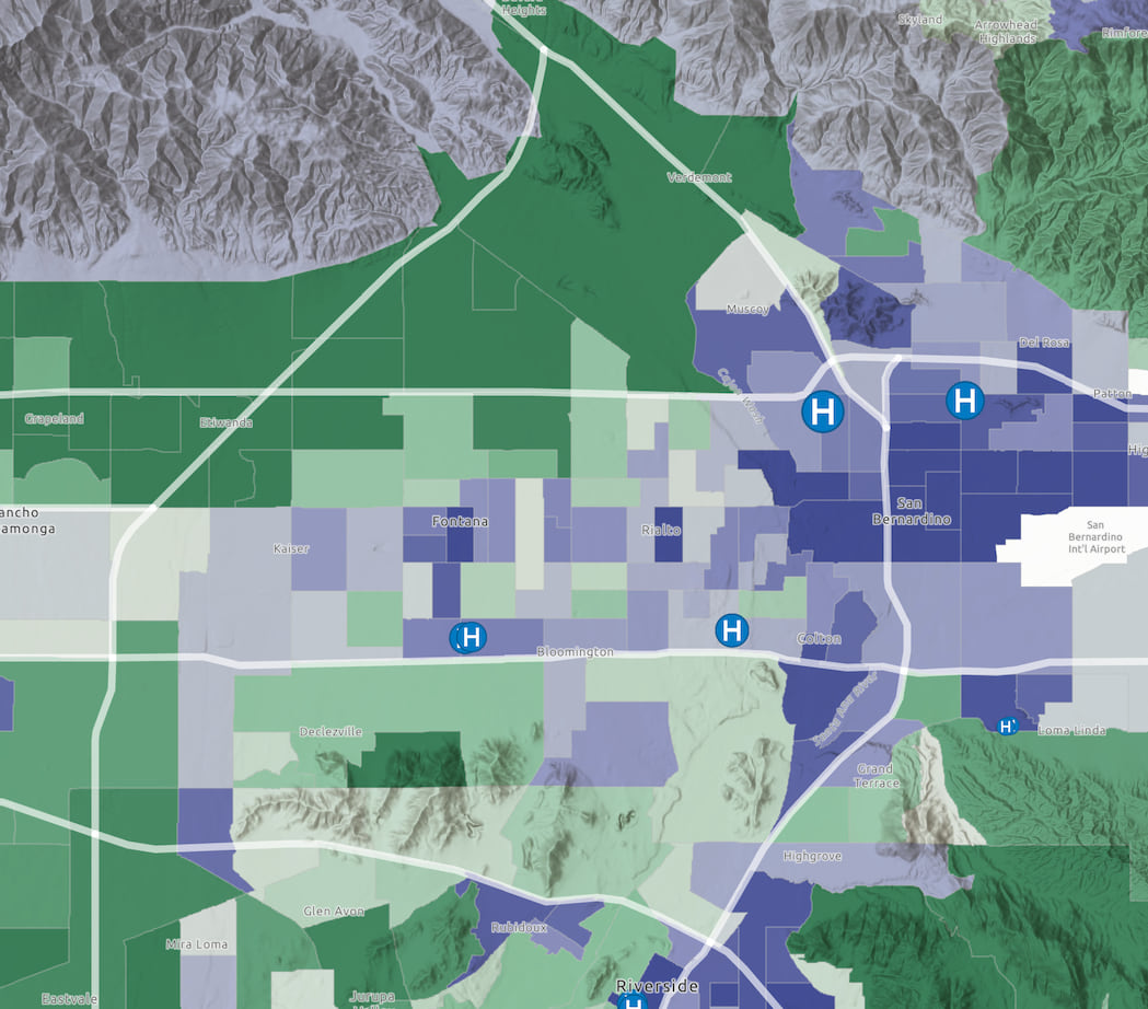 This version of the income map blends the polygon layer’s colors with a layer containing elevation data, expressed as a hillshade. You’ve probably seen maps like this in textbooks and other print maps before. They are now easily configured in an online map as well.