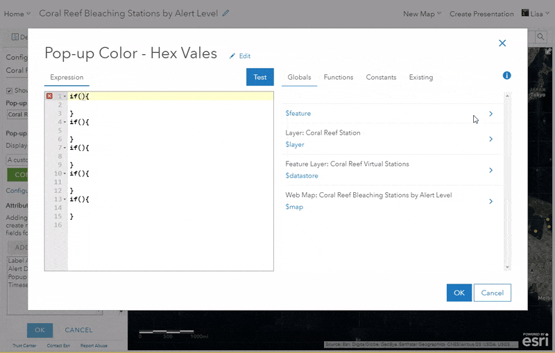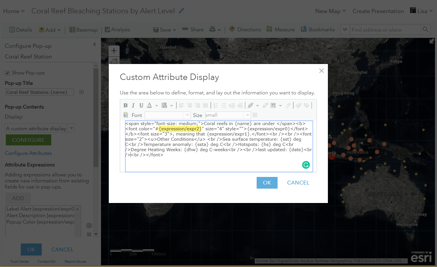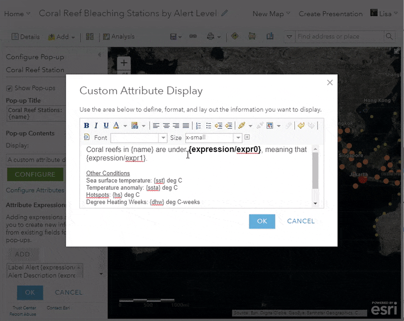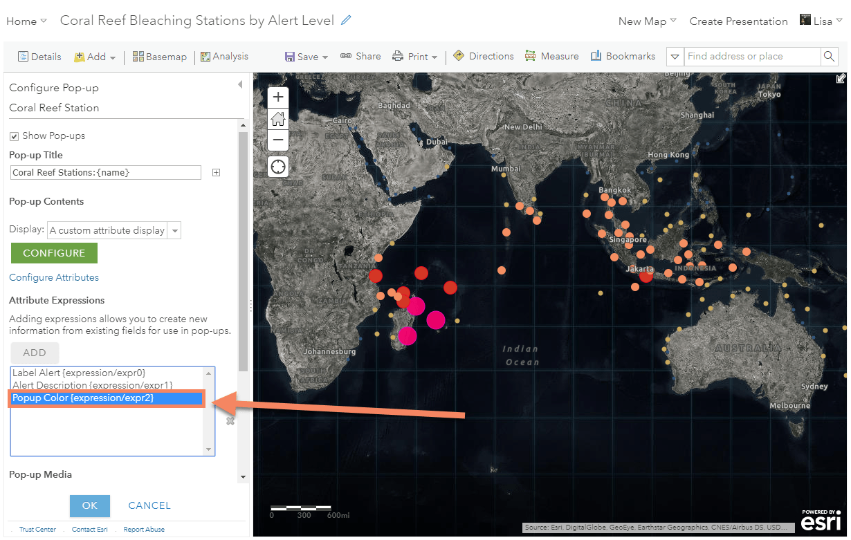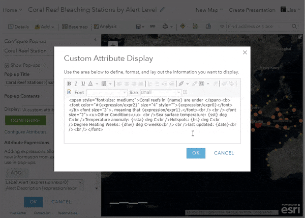 Within your layer options, configure a custom pop-up calling to the field that is being mapped. This is where you’ll use the matching map color. In the coral reef map, I want to make the alert level text to be colored. This is what my pop-up looks like before I add the color: