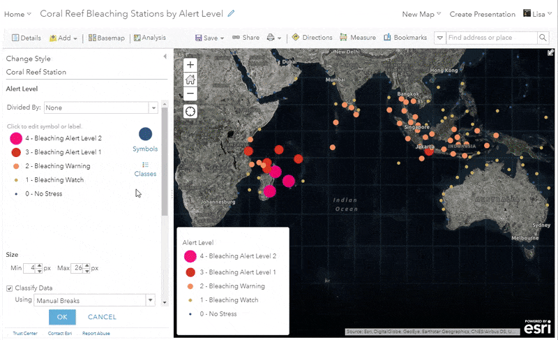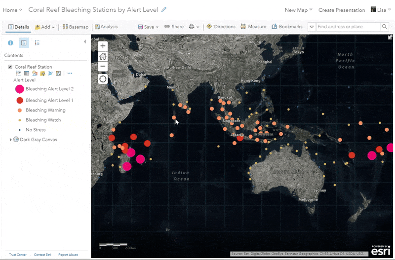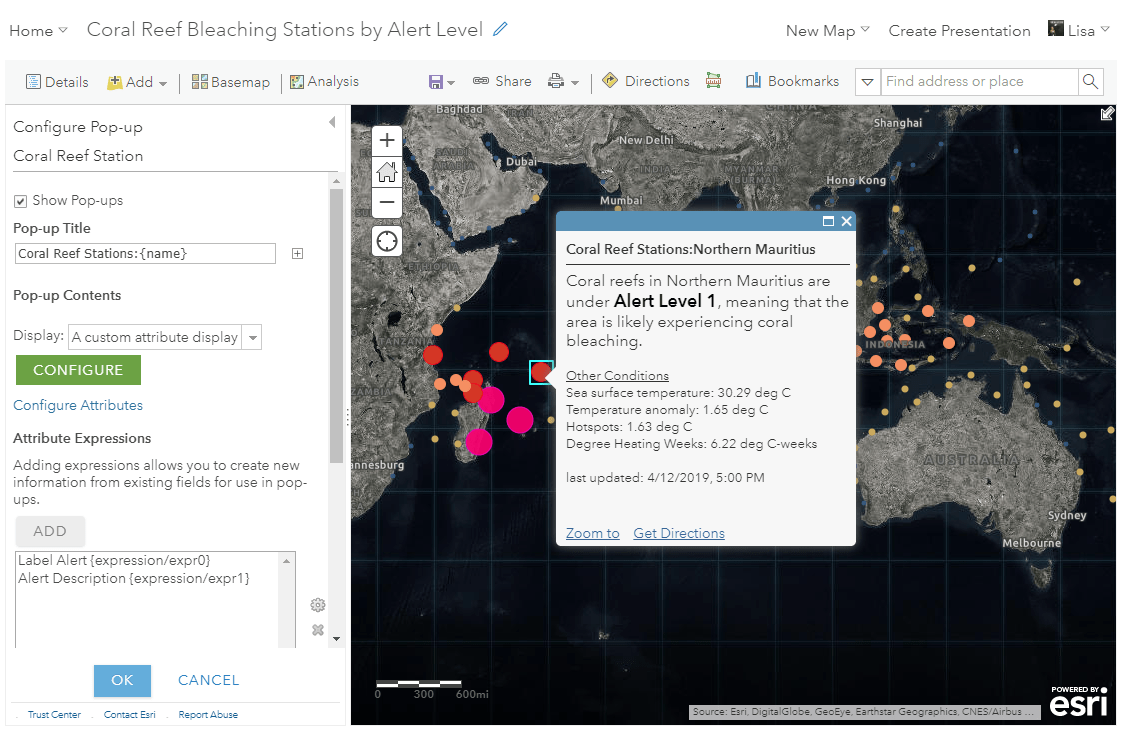 Want to make your maps easier to understand? One way to do this is to bring the colors from your map into your pop-up text. For example, this map uses this technique to show coral reef stations by the level of bleaching that is predicted to occur in different parts of the ocean. Notice how each symbol’s alert color matches the pop-up text when clicking on different stations.