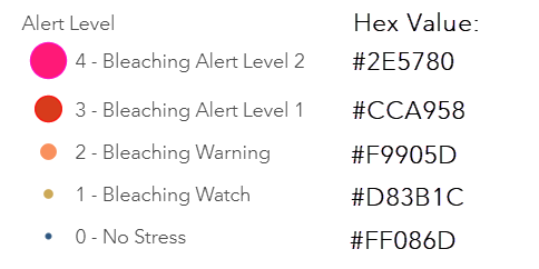 I like to take a screenshot of my legend with each hex value so that I can easily reference it later. In the coral reef example, I have five hex values. One for each alert level.