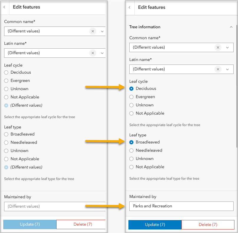 If a form has been configured on the feature layer, you will see the same layout and input (with a few exceptions listed below). The form will either display the attribute value shared by all selected features, or “Different values.” To change an attribute for all the selected features, simply enter it once and click Update.