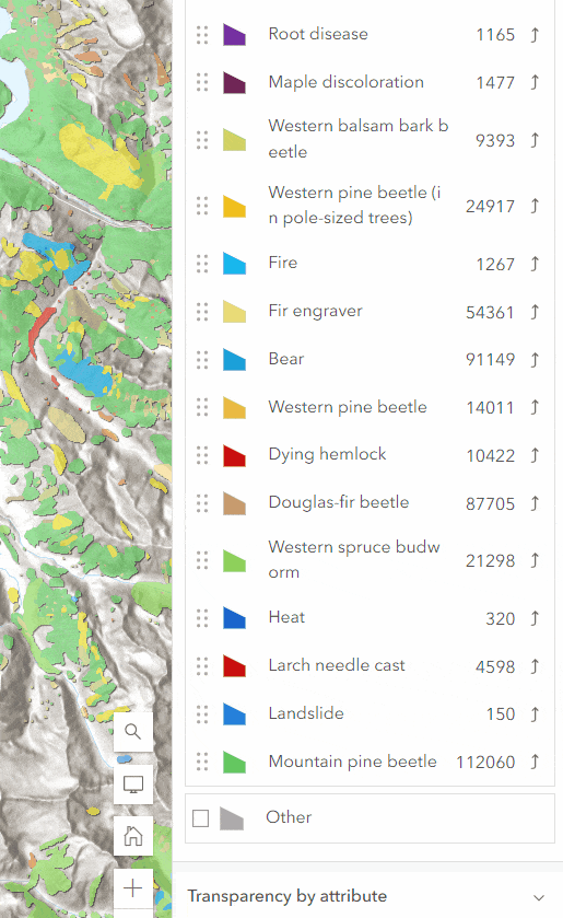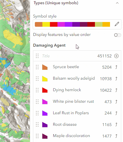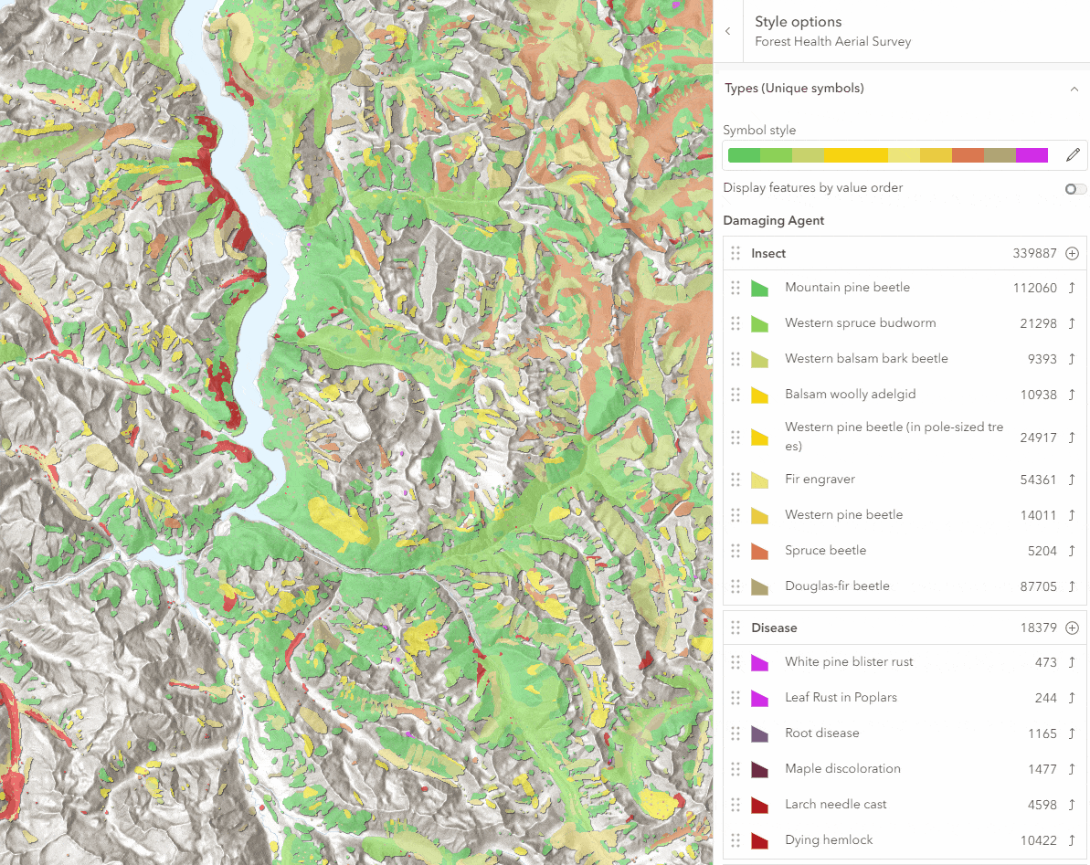 Here in this example is a Washington Forest Health Survey that is composed of polygon features that overlap with one another. This layer is using the Types style to uniquely render the different types of forest damage. The damage type reported can be categorized into two groups: insect and disease. The new grouping functionality will organize the values and help with viewers reading the legend.