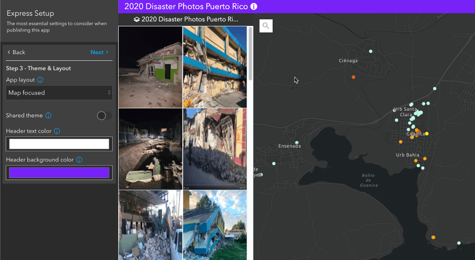 The starting location for this app will be the city of Guánica, Puerto Rico, which has a high concentration of photo locations due to a nearby earthquake in January 2020. Zoom to the area you want to be the default extent of your map, which is the area of the map that will be visible to the app user when the app is launched. Save the web map.