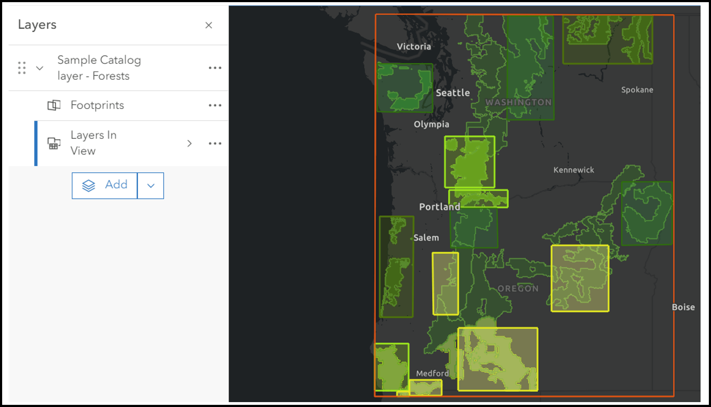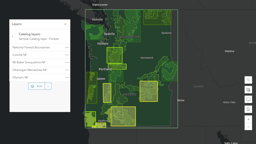 Catalogs can be used for regional projects. They can also be a visualization tool, allowing others to gather information at a glance. In this example, we’ve styled the Footprints layer to reflect the project status for each Forest in the Region.