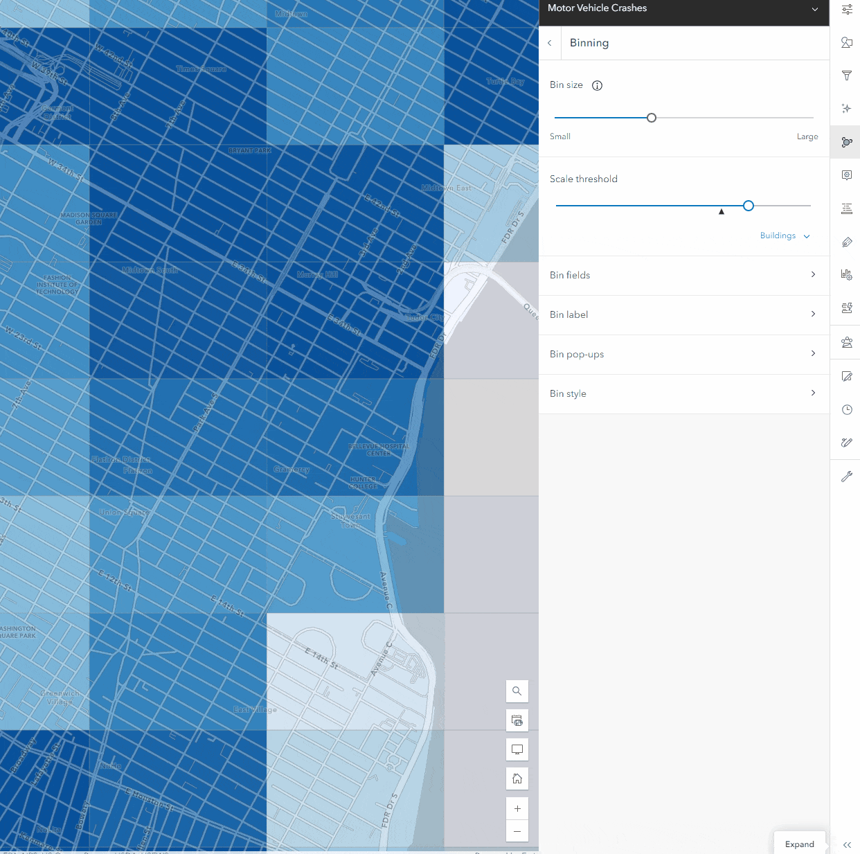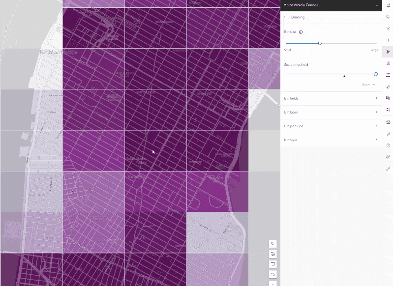 When binning is enabled, it will generate a set bin size suitable for the map scale currently being viewed, which can be customized. The size does not change like clustering when you zoom in and out, as you will see in the gif below. This makes setting a scale threshold for binned data particularly useful when zoomed in to a level where the size of the bins does not help the viewers understand any aggregation patterns. Setting the bin threshold is in the same place as clustering, and once you see the level that will help the users, the features will be displayed without the binning applied.