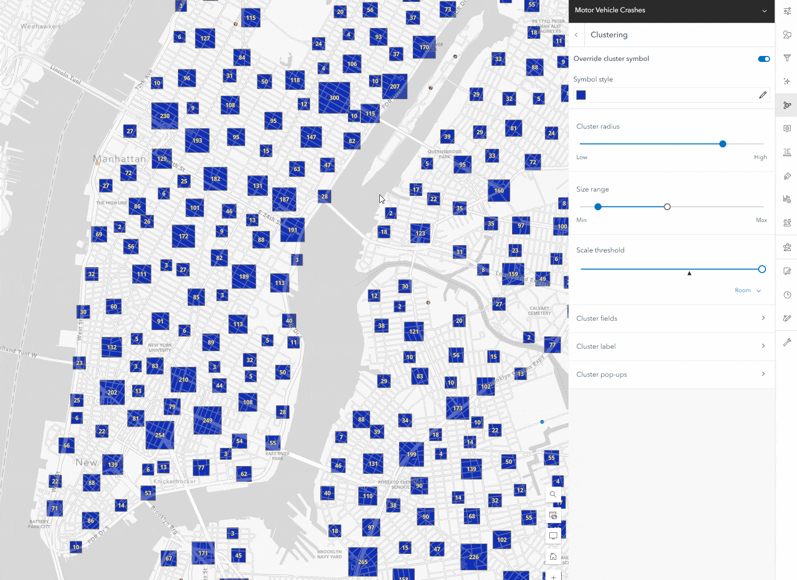 Opening the clustering panel, you will see the configuration controls, like setting a symbol override, cluster radius, and size. Below that is the scale threshold. In the gif below, you will see that zooming in and out will change the clusters, but they will remain. Once you set the threshold, you will see that zooming past that set level in the map view will disable clustering, and you will see individual features