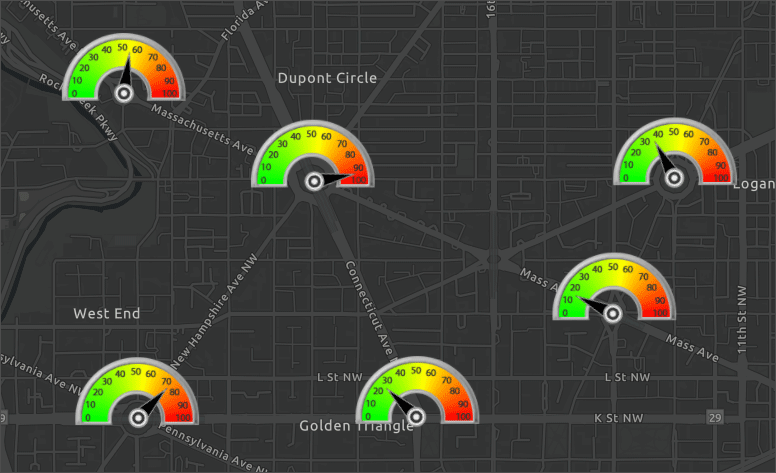 The map below uses stacked symbols to show locations. The needle symbol is rotated using a value associated with the location. The value shown on the dial ranges from zero to 100. Note that each dial is displaying a unique value.