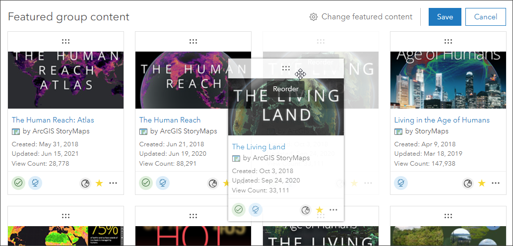 A great way to showcase the best layers, maps, or apps in your groups is to highlight specific group content. By default, the content gallery for a group displays the most recently added items under the group description. Group owners, group managers, and members with administrative privileges to manage content in groups can curate a gallery of featured group content instead of showing recently added items. Follow these steps to learn how.