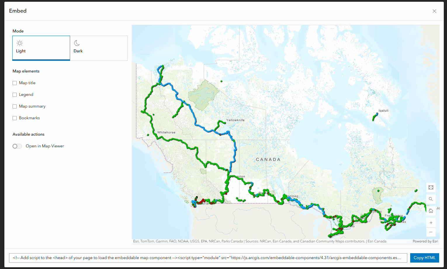 Once you have selected the settings you want, simply click the Copy HTML button to copy the code required to embed your map. The copied HTML code contains a script tag and the custom element with the map to embed. The script tag should be pasted into the <head> of your page. The custom element should be added to the <body> of your page where you want the map to appear. Both are required for the embedded map to display. Once copied, you can further edit the code if needed to change the size, remove map elements you no longer want, or even swap out the web map ID. In this example, I’ve created a basic website documenting some adventures on the Trans Canada Trail and I’d like to embed this Trans Canada Trail map from the Living Atlas.