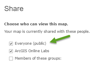 Step 2. Share the map publicly. This enables the Embed In Website button shown in Step 3 below.