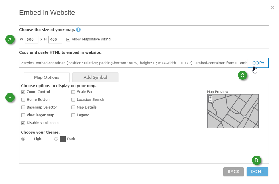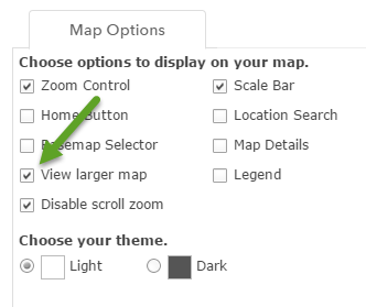 B. Choose the desired Map Options. For example, you may want to include a view larger link, or a Home button, or may want a dark theme instead of a light one.
