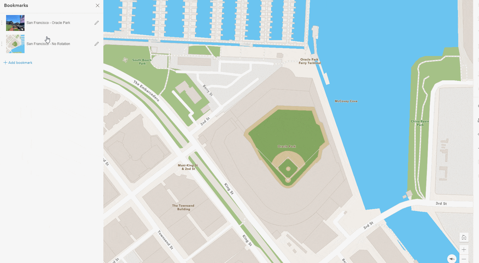 Once you hit “Add”, a new bookmark will be created and added to your web map. By default, a screenshot of your map will be taken and set as the bookmark’s thumbnail.