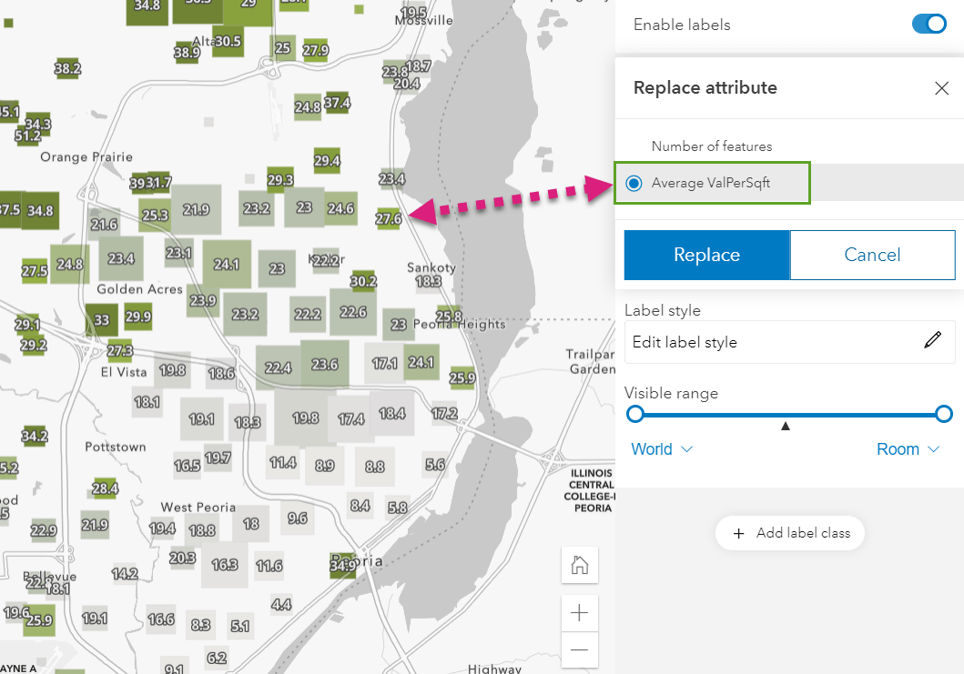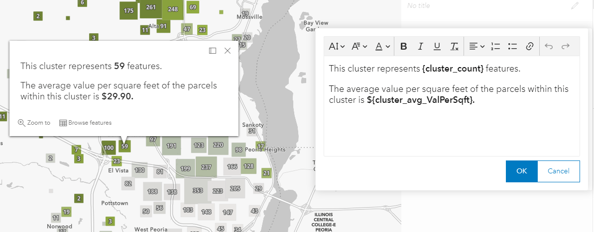 Consider the map from earlier that showed the average value of parcels in Peoria County. If I want to communicate the average value of the parcels in each cluster, I can change the pop-up to include a dollar sign and customized text.