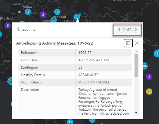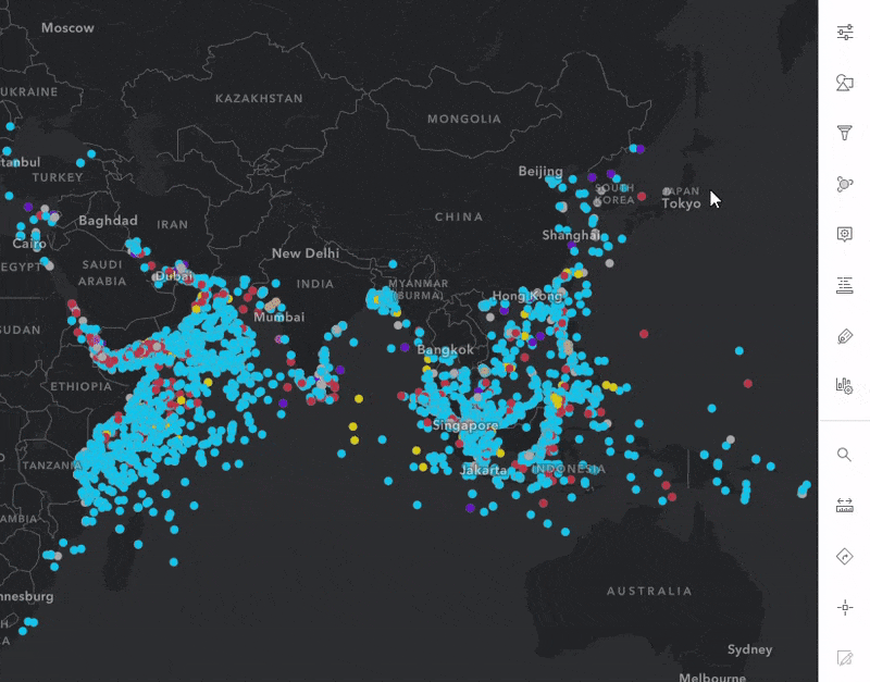 Within Map Viewer, clustering appears on the Settings toolbar on the right as its own button. The Clustering button will appear automatically when mapping point features. Choose to enable clustering and the map will translate your existing map symbology into clustered features. For example, the map below shows historic piracy events, like we have seen in John Nelson’s Piracy & Time Travel blog. When clustered, the different types of piracy are grouped and represented with the color of the most common type of piracy. The size of the symbol shows how many events of piracy are within that cluster.