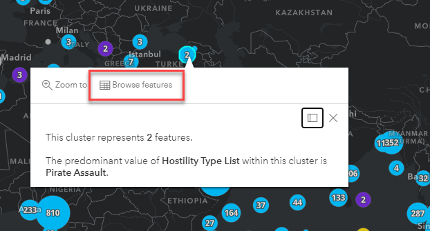 Within a cluster pop-up, you can choose to zoom into the features within that cluster or browse the specific features within a cluster in order to learn more.