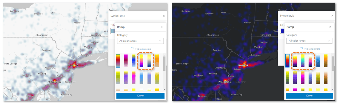 Map Viewer has refined the categorization of color ramps, aligning them with the basemap theme leveraged in the web map. For instance, when using a dark basemap, brighter color ramps are prioritized at the top of the list to accentuate patterns within our data. In the following images, observe how smart mapping intuitively suggests color ramps that complement the basemap. Additionally, spot the five new ramps!