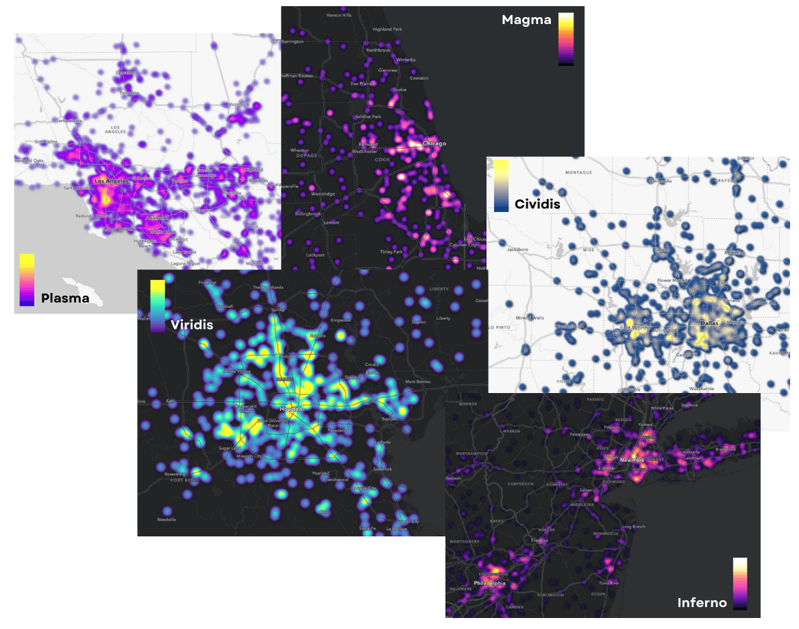 We’re thrilled to announce five new color ramps in Map Viewer for the heat map and color styles: Plasma, Cividis, Viridis, Magma, and Inferno. Also incorporated in ArcGIS Pro, these scientific ramps have been crafted to improve support for color vision deficiencies and elevate data visualization on the web.