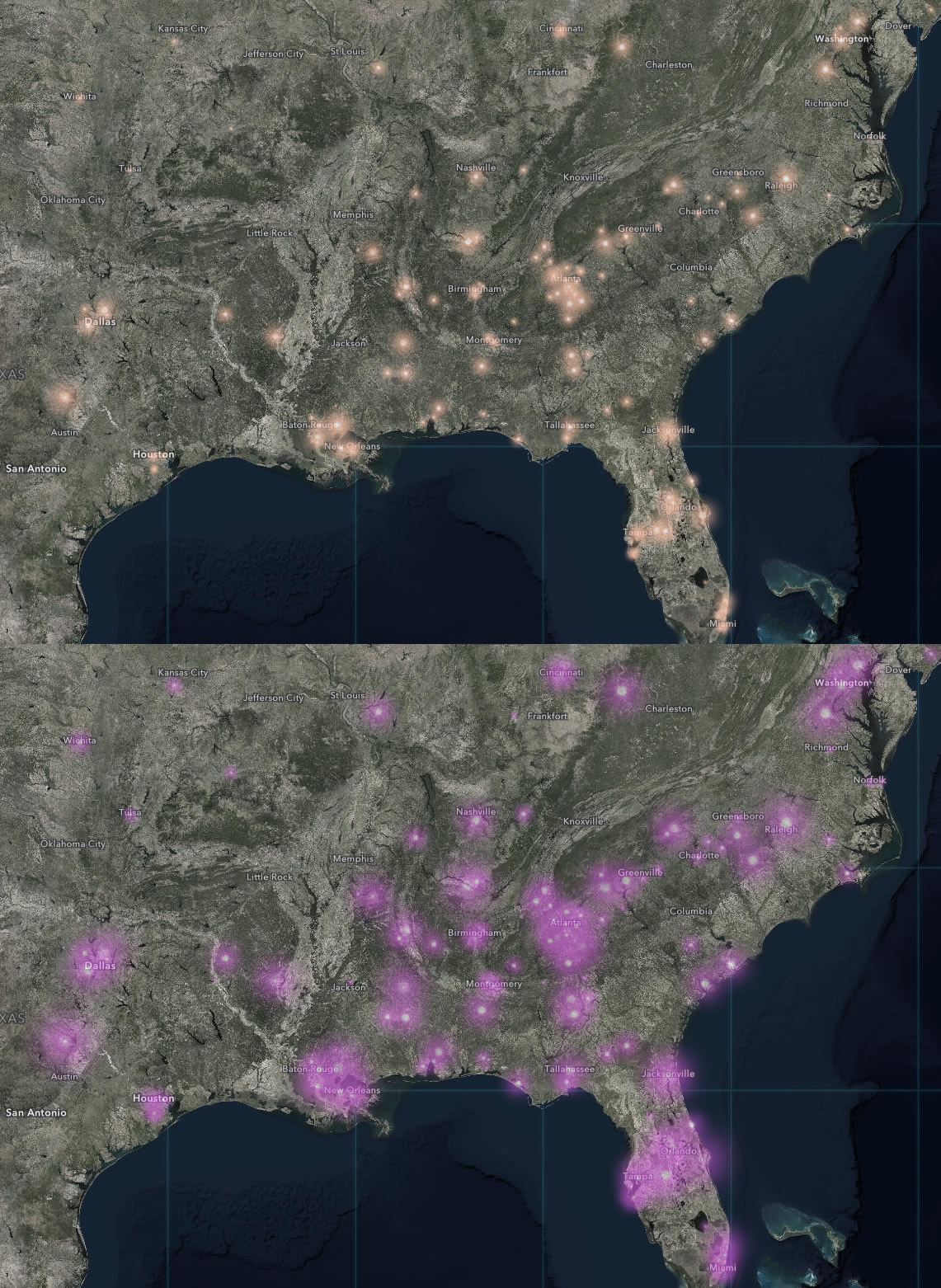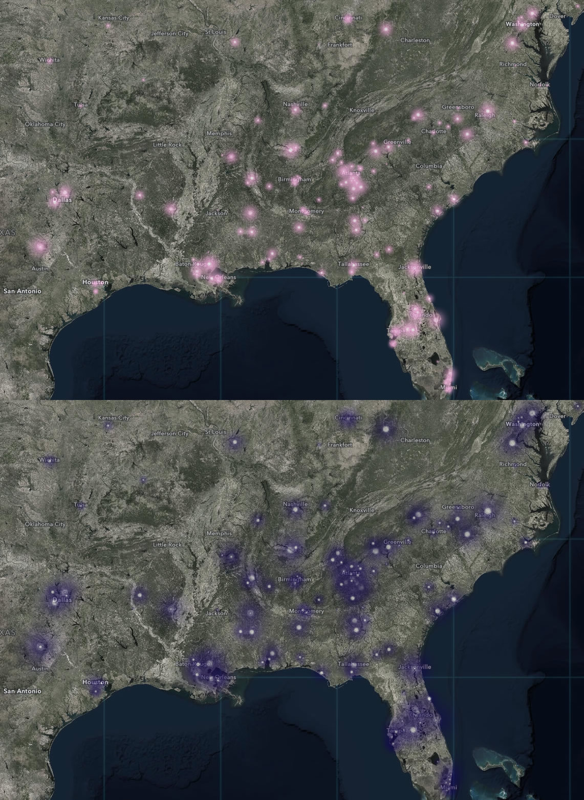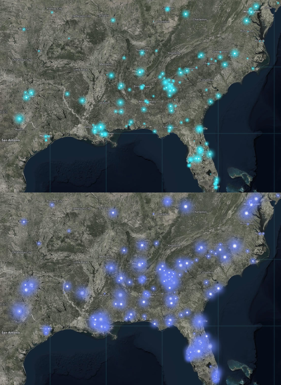 Each symbol in the library is a monochromatic radial decay in opacity. One color. But you can whip up some really beautiful symbols by stacking a couple of these hues. In ArcGIS Online, you just duplicate the layer, and apply your design will to it. In these examples I pushed the symbol transparency to 50 or 75%, and I gave the topmost layer a bit smaller symbol size. You’ll also want to remove the pop-up for one of the layers, so you don’t get redundant overlapping pop-up interactions. Ok, all the boring bits have been addressed, let’s dive into the chromatic fun…