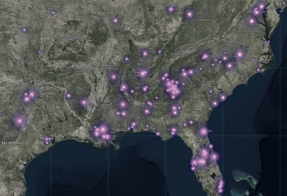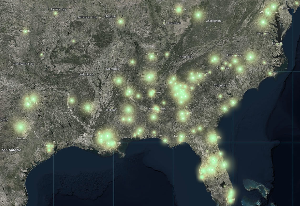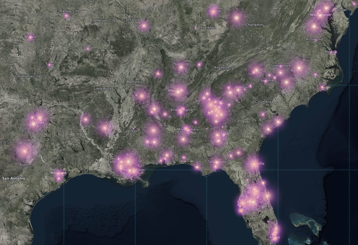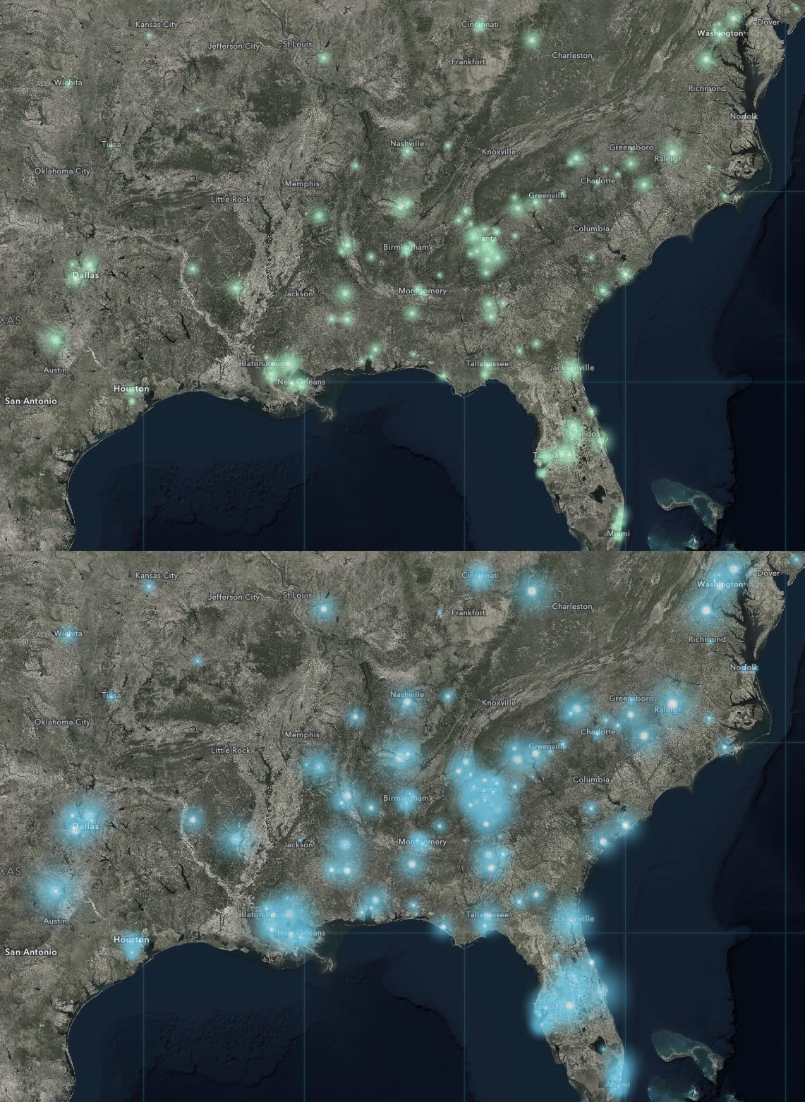 Each symbol in the library is a monochromatic radial decay in opacity. One color. But you can whip up some really beautiful symbols by stacking a couple of these hues. In ArcGIS Online, you just duplicate the layer, and apply your design will to it. In these examples I pushed the symbol transparency to 50 or 75%, and I gave the topmost layer a bit smaller symbol size. You’ll also want to remove the pop-up for one of the layers, so you don’t get redundant overlapping pop-up interactions. Ok, all the boring bits have been addressed, let’s dive into the chromatic fun…