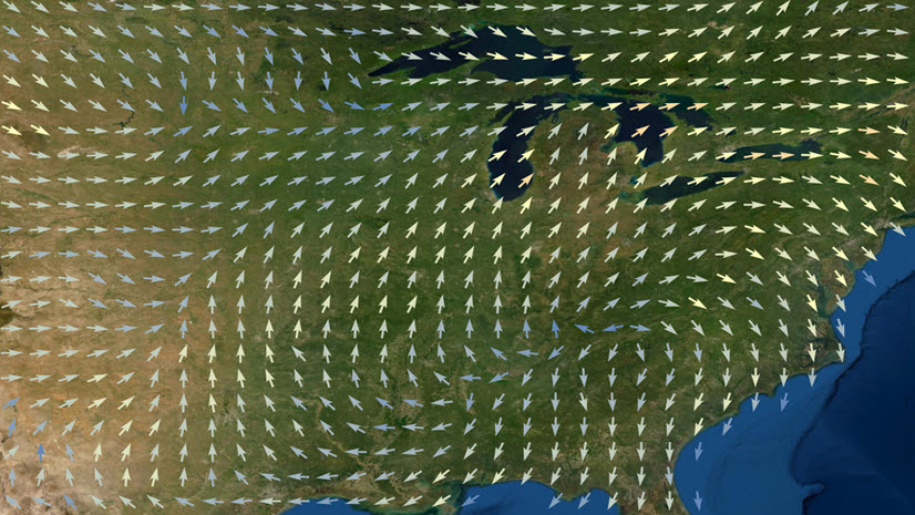 This map uses flowlines to depict daily wind speed and magnitude for one year in the US. Fast winds create faster, thicker lines. A color ramp has also been applied to the lines to reinforce this: yellow lines show the highest wind speeds. As a map author you have a choice with flow maps to show the lines using a single color or a ramp.