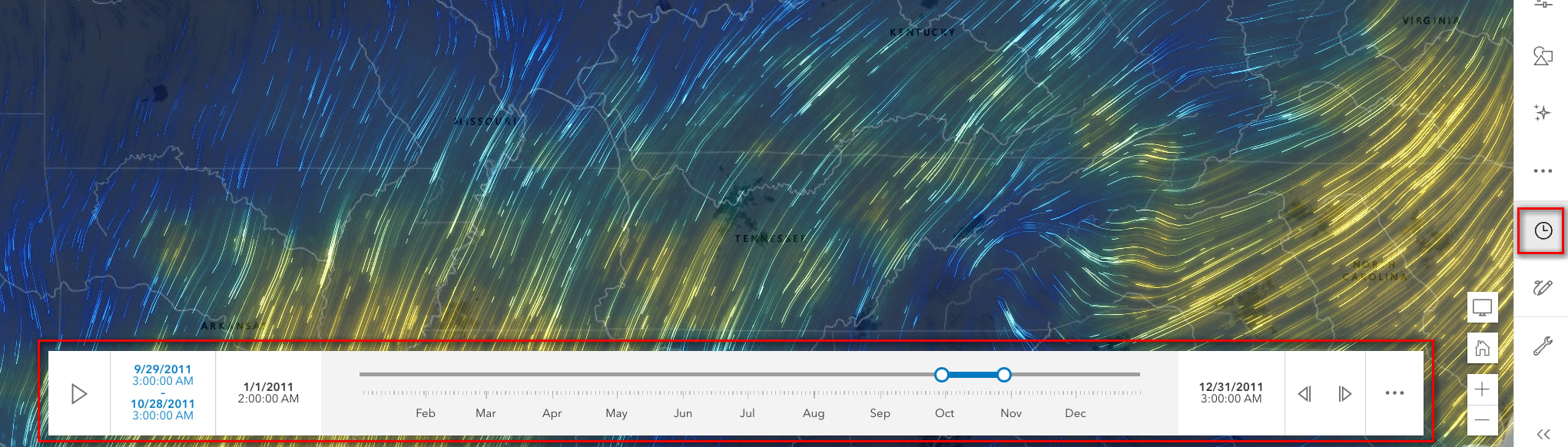 The UI allows you to adjust the speed, density, length and width of the lines. Switch between Flowline and Wavefront right at the top of the pane. If you use a color ramp be sure to use the handles on the side to change how the colors get applied to the data values; it can make a dramatic difference in the appearance of the map. If you don’t like the effects applied you can quickly turn them off at the bottom of the pane, or go to the Effects pane itself to tweak them or use different Effects entirely!