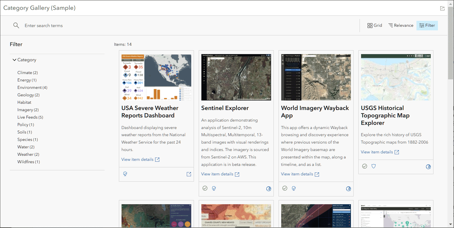 Category Gallery offers users a way to explore the content using search or filters, including categories defined at the group or organization levels. The key value that this app provides is the ability to leverage categorized content from a group. This example shows the app opened with filter and categories displayed.